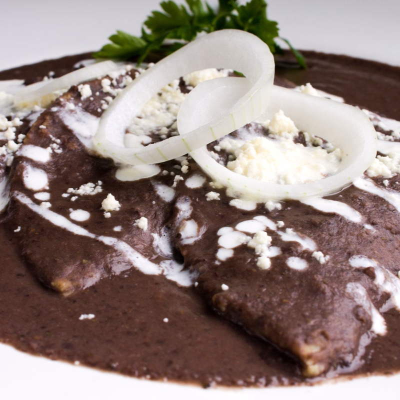 (6 pzs) rellenas de pollo deshebrado, bañadas en salsa de frijol perfumada de chipotle cubiertas con crema y queso