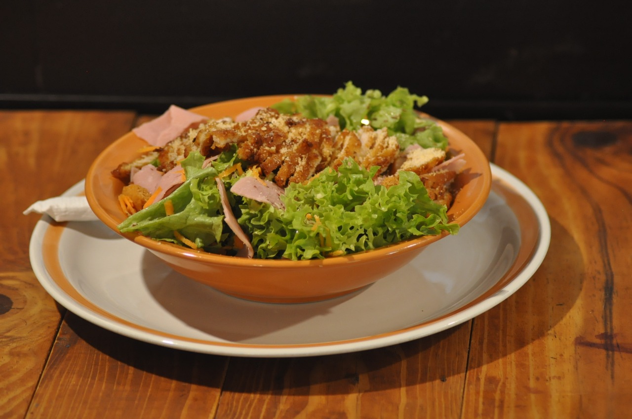 Tiras de pechuga empanizada, mix de lechuga, almendras, zanahoria, trocitos de jamón, crotones y queso parmesano.