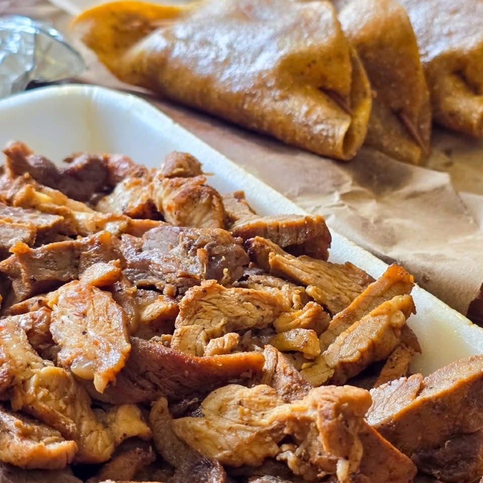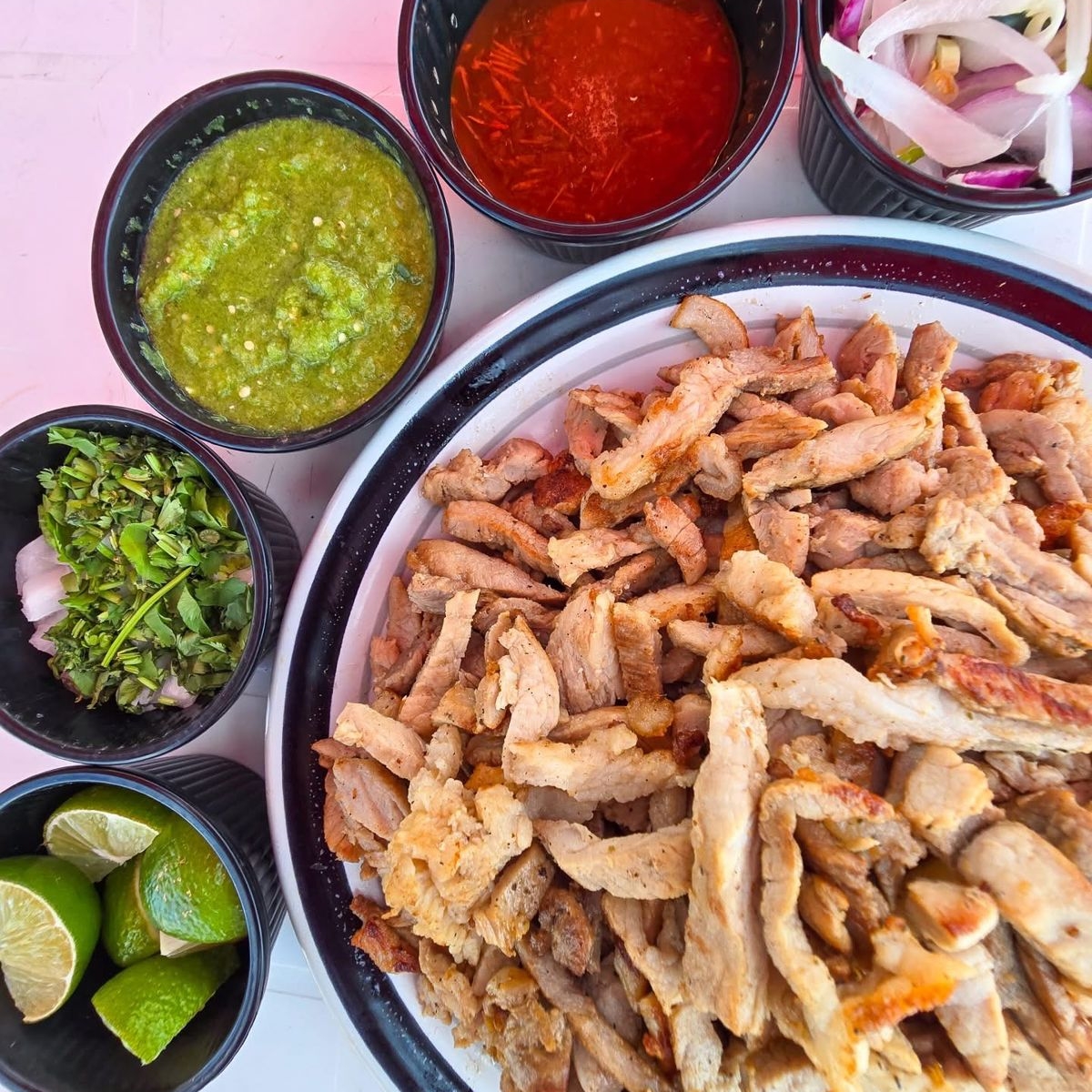 1/4 de maciza acompañado de 100 gramos de tortillas, cilantro, cebolla, limones, salsa verde, salsa roja y ensalada de pepinos con habanero