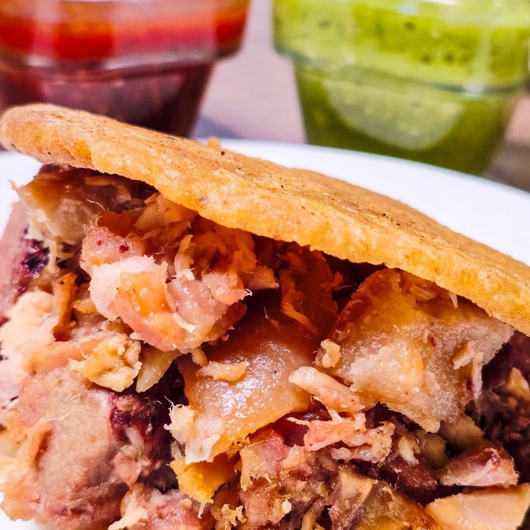 4 Gorditas de chicharrón rellenas de carnitas, 4 sesadillas de sesos o 4 tacos dorados de carnitas, refresco de sabor o coca cola de 1.35 ml, cilantro, cebolla, limones, salsa verde, salsa roja y ensalada de pepinos con chile habanero.