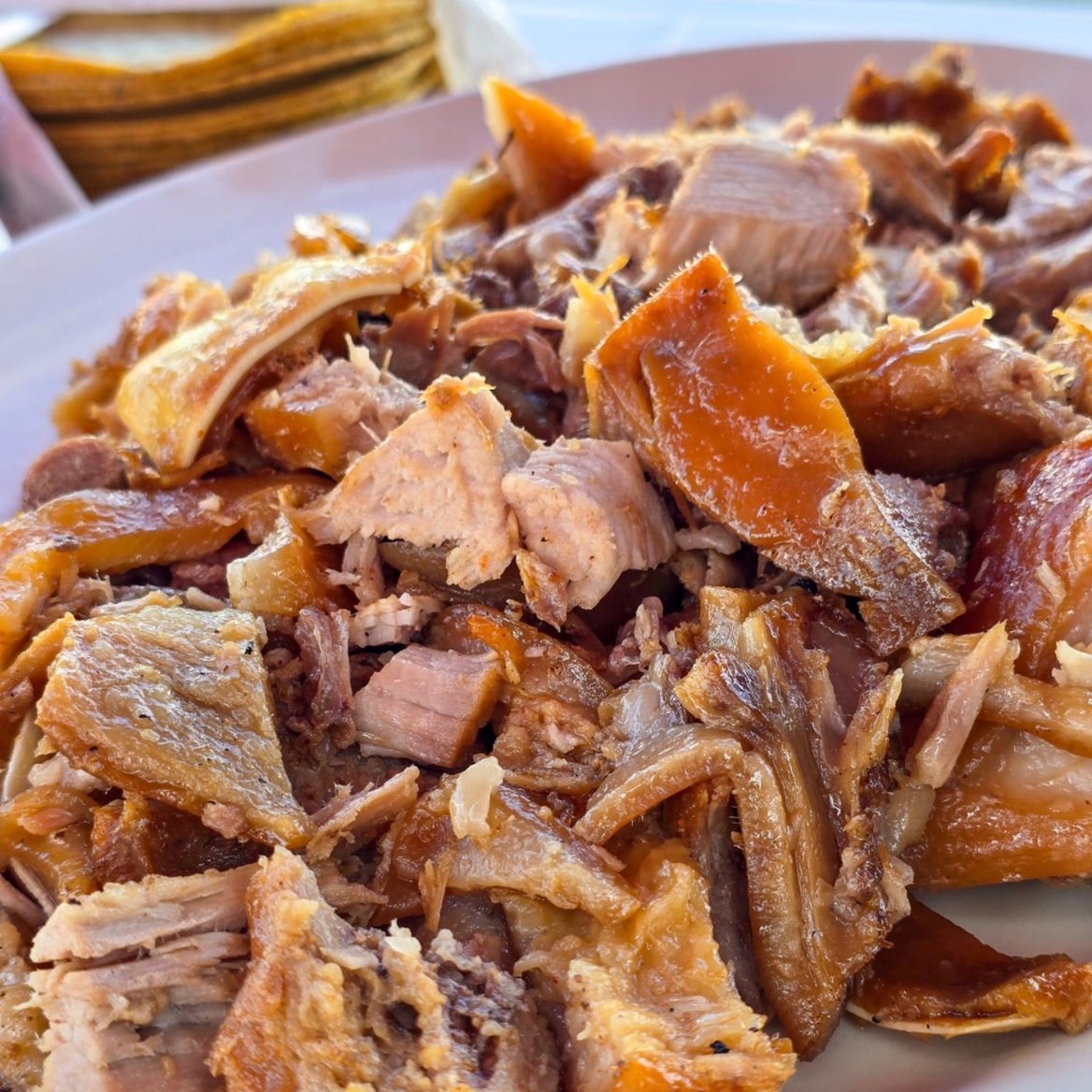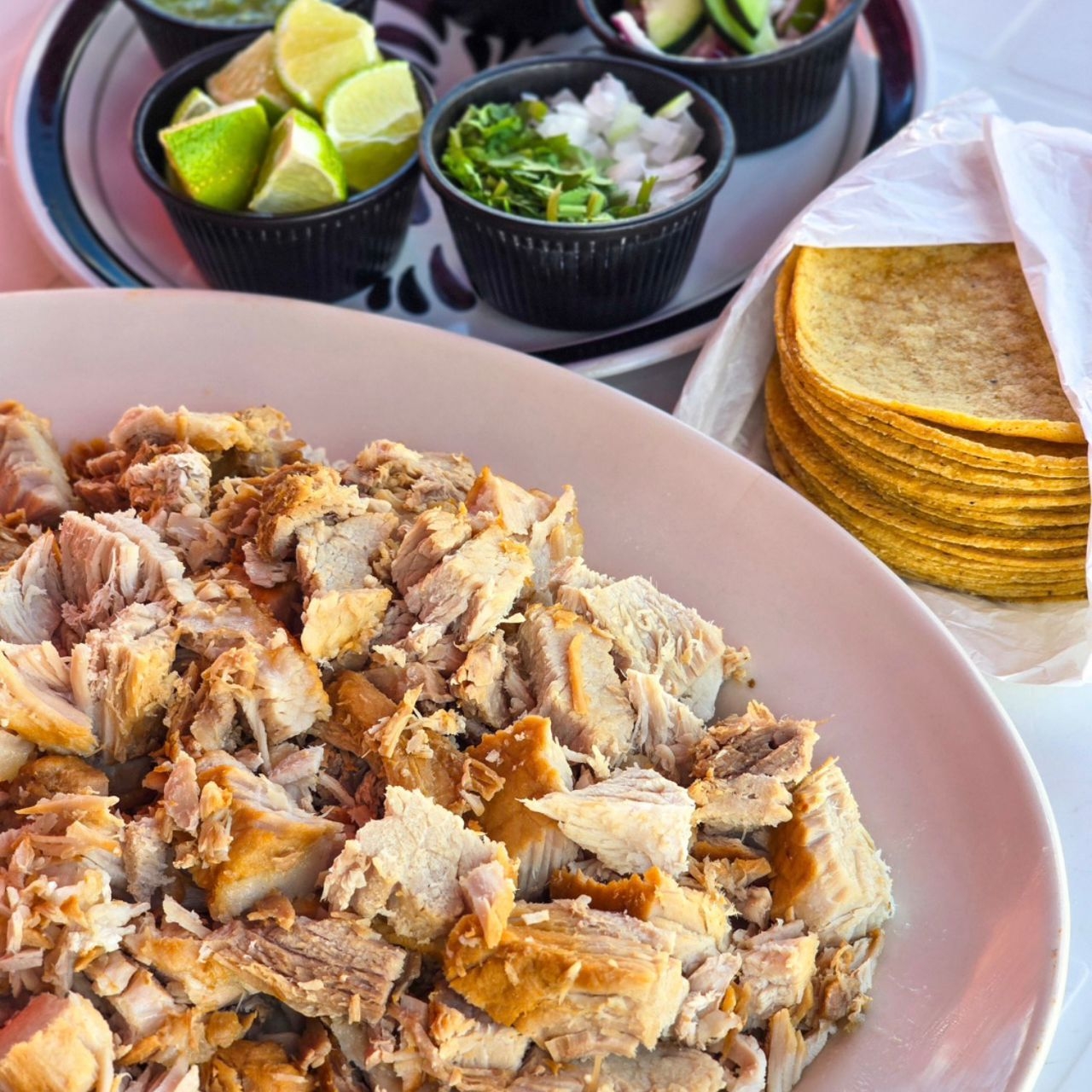 1/4 De carnitas surtidas, 100 gramos de tortilla, cilantro, cebolla, limones, salsa verde, salsa roja y ensalada de pepinos con chile habanero.