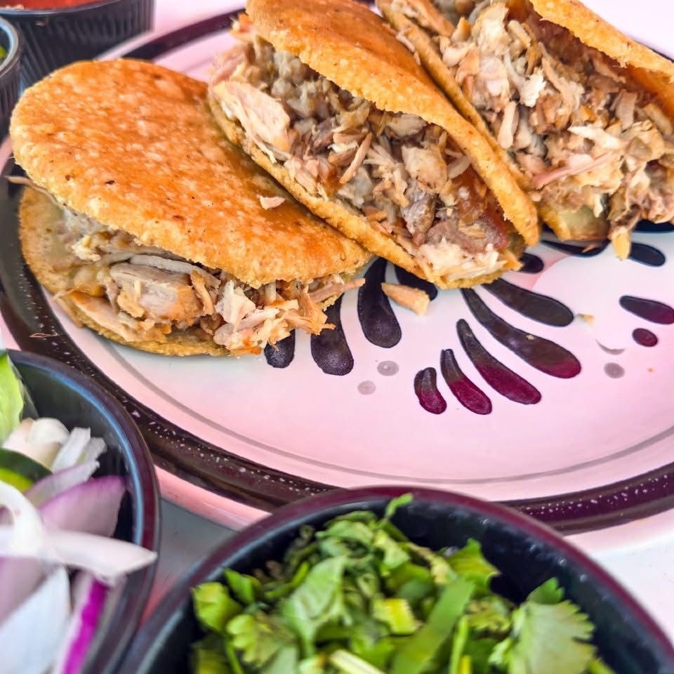 Deliciosas gorditas de carnitas surtida acompañadas de su cilantro, cebolla, salsas y limones
