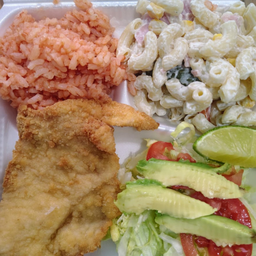 Comida Milanesa de Pollo empanizada acompañada de arroz ,ensadala y frijoles