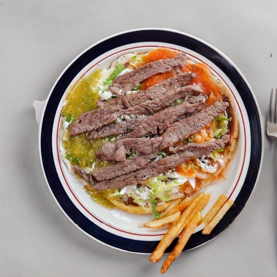 Tortilla de masa (30 cm), frita, frijoles refritos de la casa, salsa verde y/roja no picante, 250 gr. de suave y jugoso bistec sirloin, lechuga, cebolla, cilantro, crema y queso fresco.
