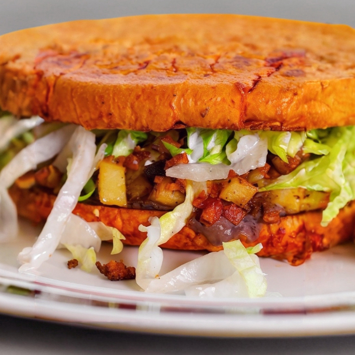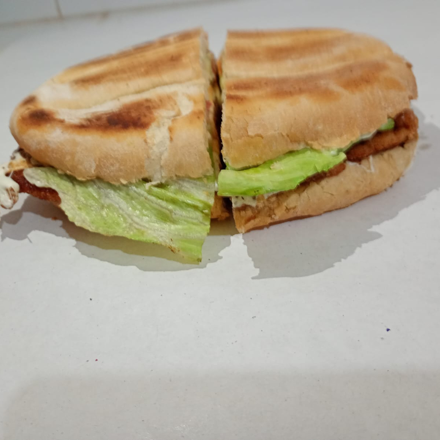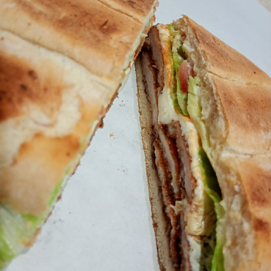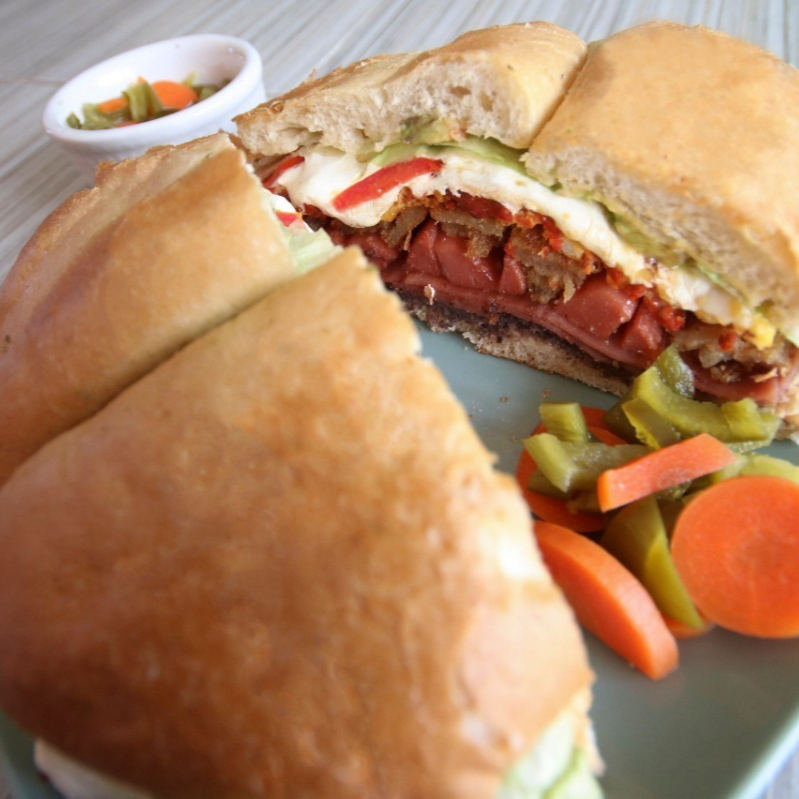 Bolillo doble, Milanesa de res, queso Oaxaca, acompañada de frijoles en la base, mayonesa, aguacate, jitomate y lechuga fresca.