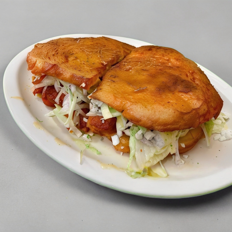 GORDITA DE MASA FRITA Y CRUJIENTE RELLENA DE CHORIZO CON PAPAS, ACOMPAÑADA DE CEBOLLA, CILANTRO, LECHUGA, CREMA Y QUESO FRESCO.