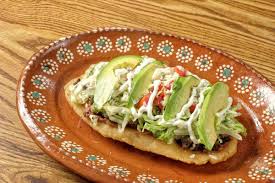 Tortilla de masa pellizcada y frita en manteca, frijoles refritos de la casa, suave bistec de res, salsa verde y/o roja no picante, lechuga, cebolla, cilantro, crema y queso fresco.