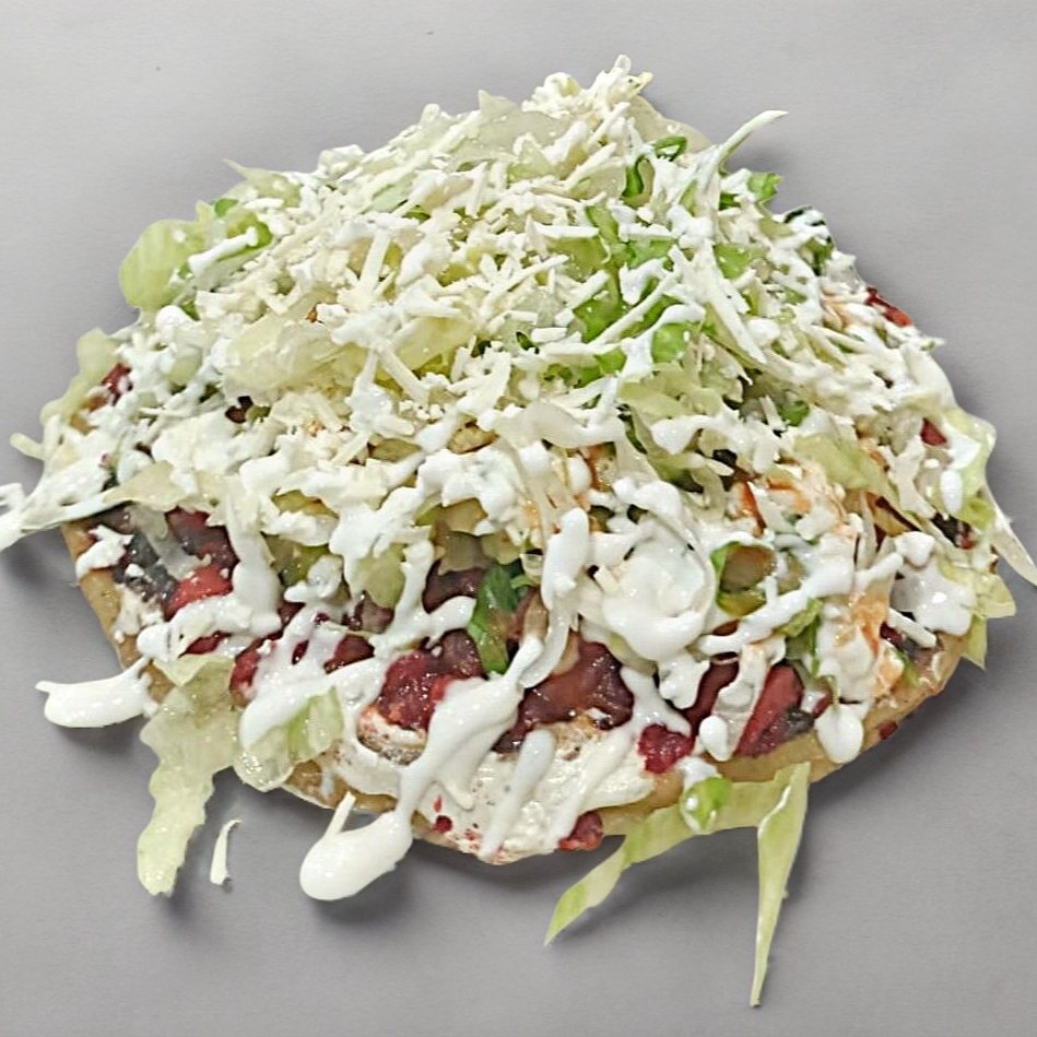 Tortilla de masa (30 cm), frita, frijoles refritos de la casa, deliciosa Tinga de pollo, lechuga, cebolla, cilantro, crema y queso fresco.