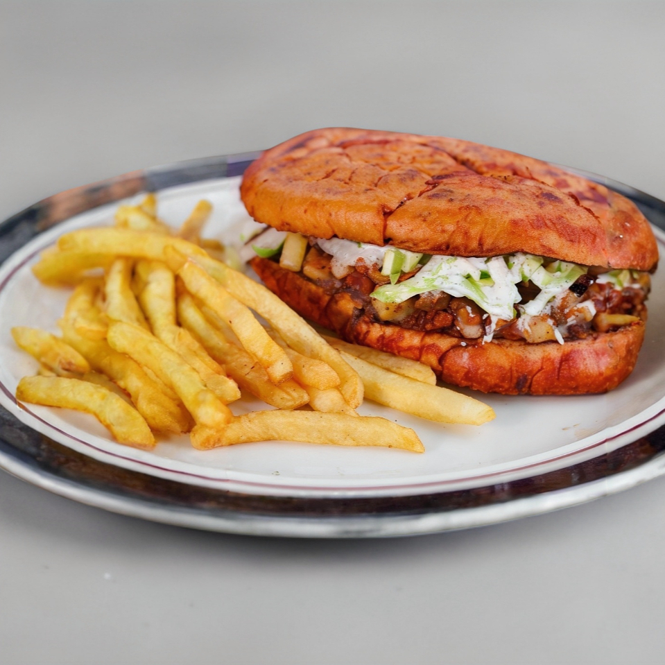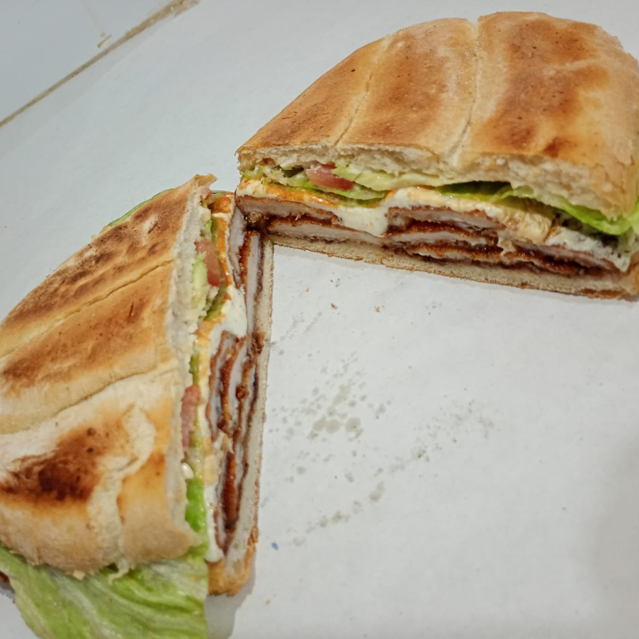 Bolillo doble, Bistec de cerdo, queso Oaxaca, acompañada de frijoles en la base, mayonesa, aguacate, jitomate y lechuga fresca.