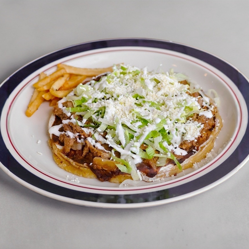 Tortilla de masa pellizcada y frita en manteca, frijoles refritos de la casa, deliciosa tinga de res, lechuga, crema y queso fresco.