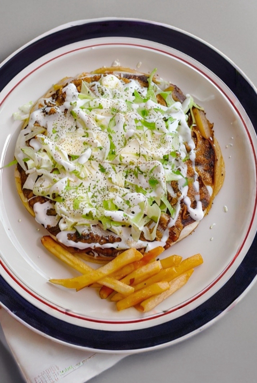 Tortilla de masa pellizcada y frita en manteca, frijoles refritos de la casa, papas con chorizo, salsa verde y/o roja no picante, lechuga, cebolla, cilantro, crema y queso fresco.