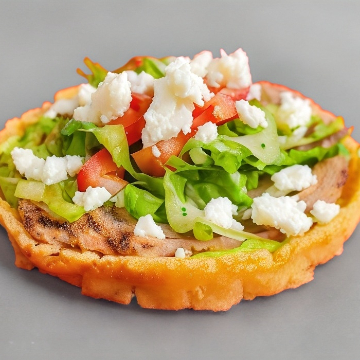 Tortilla de masa pellizcada y frita en manteca, frijoles refritos de la casa, deliciosa tinga de pollo, lechuga, crema y queso fresco.