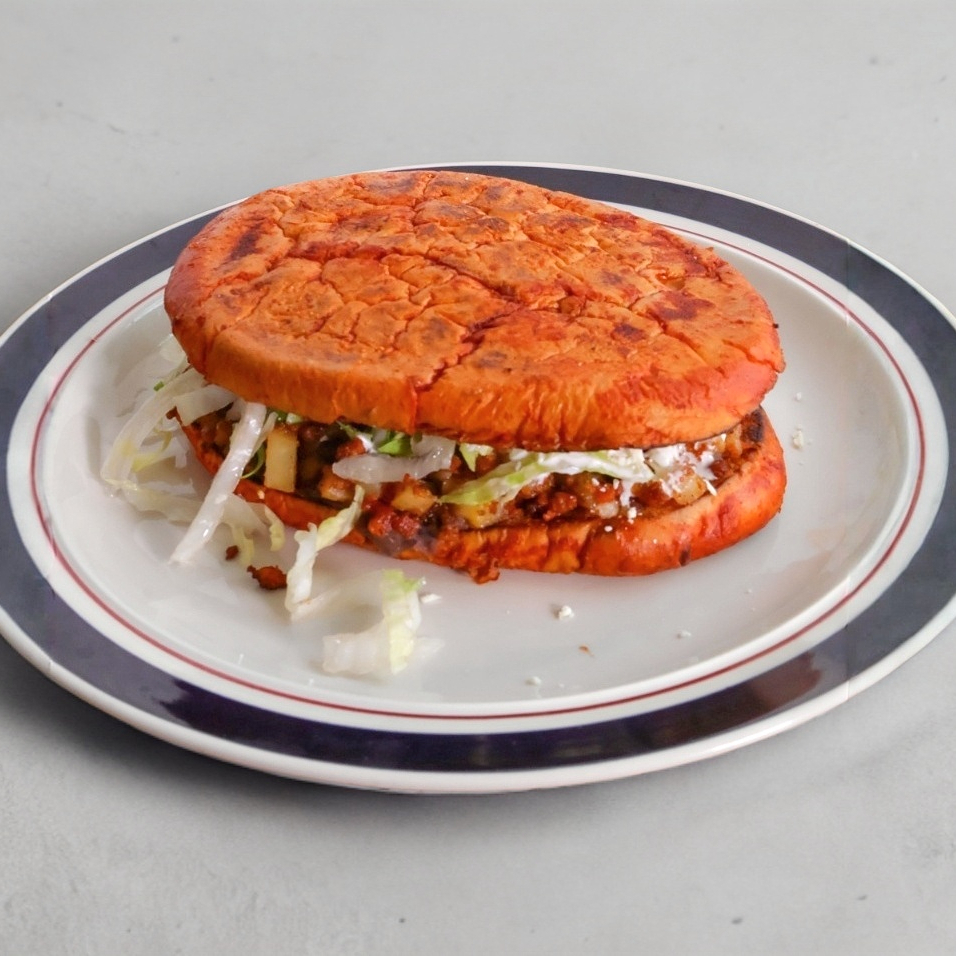 Pan pambazo remojado con chile guajillo y doradito, Frijoles refritos de la casa, suave Bistec sirloin, lechuga, crema y queso fresco.