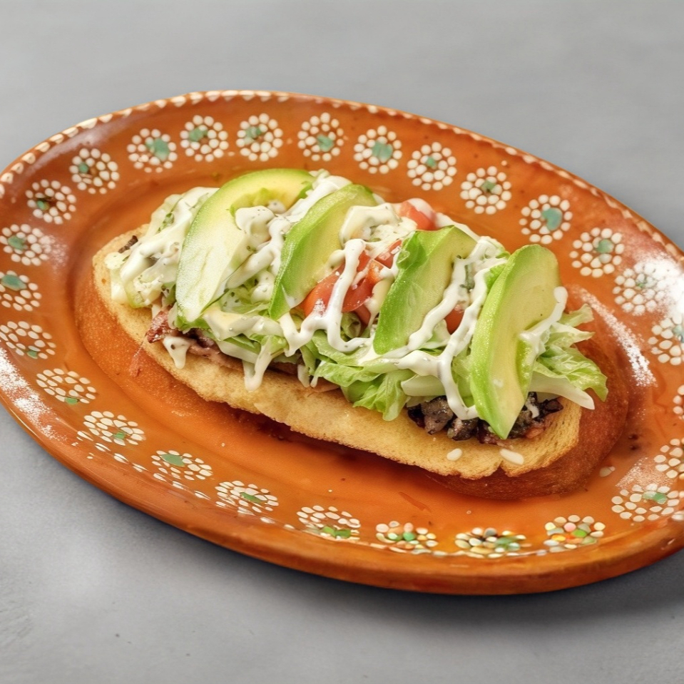 Tortilla de masa (30 cm), frita, frijoles refritos de la casa, salsa verde y/roja no picante, delicioso chicharrón prensado (natural), lechuga, cebolla, cilantro, crema y queso fresco.