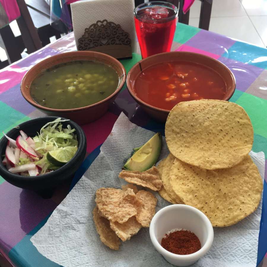 Delicioso Pozole Rojo de Cerdo ó de Pollo, acompañado de lechuga, rábanos, tostadas, limones, oregano y chile cortado.