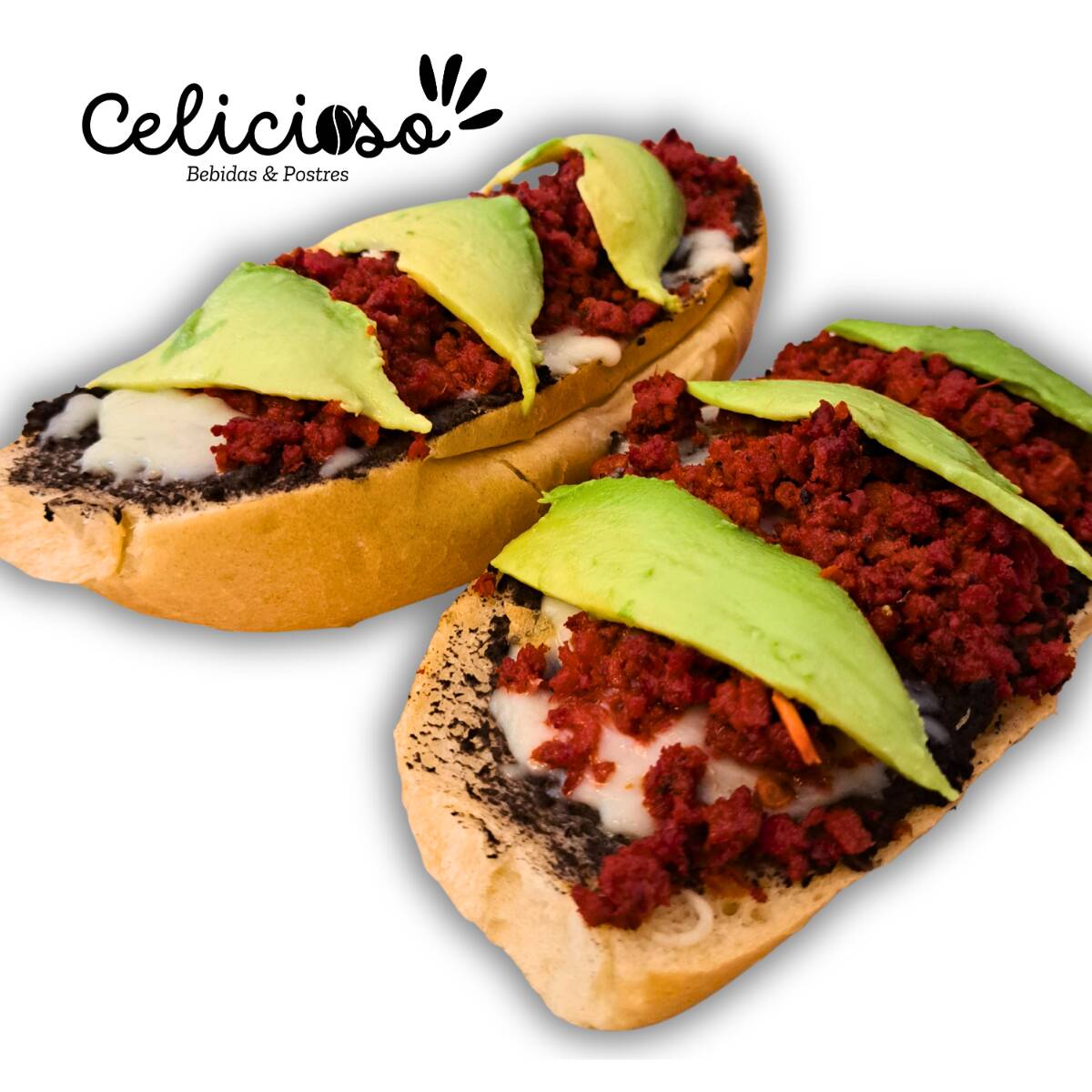 Pan bolillo crujiente con frijoles refritos y queso gratinado al punto perfecto acompañado de chorizo, aguacate y salsa casera.