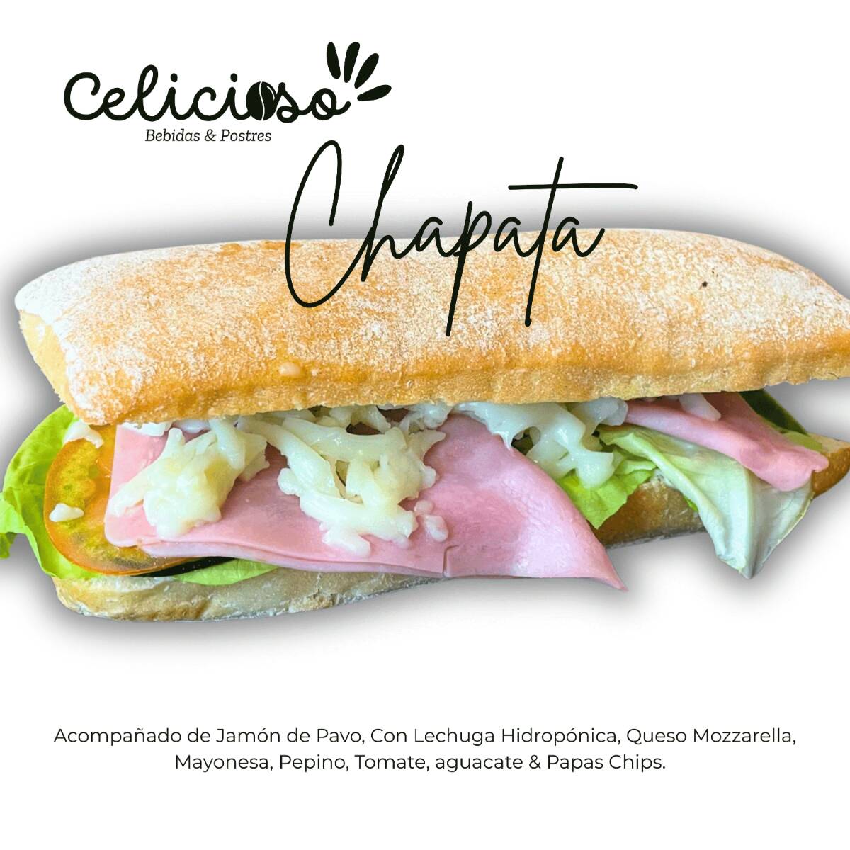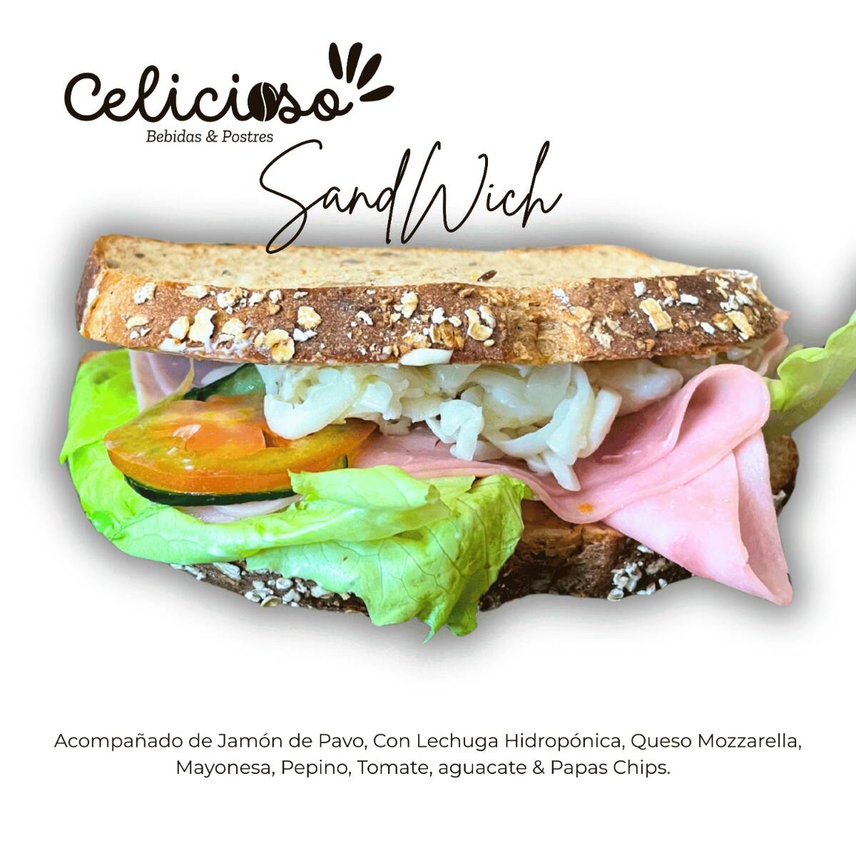 Acompañado de jamón de pavo con lechuga, queso mozzarella, mayonesa, pepino, tomate, Aguacate y papas chips.