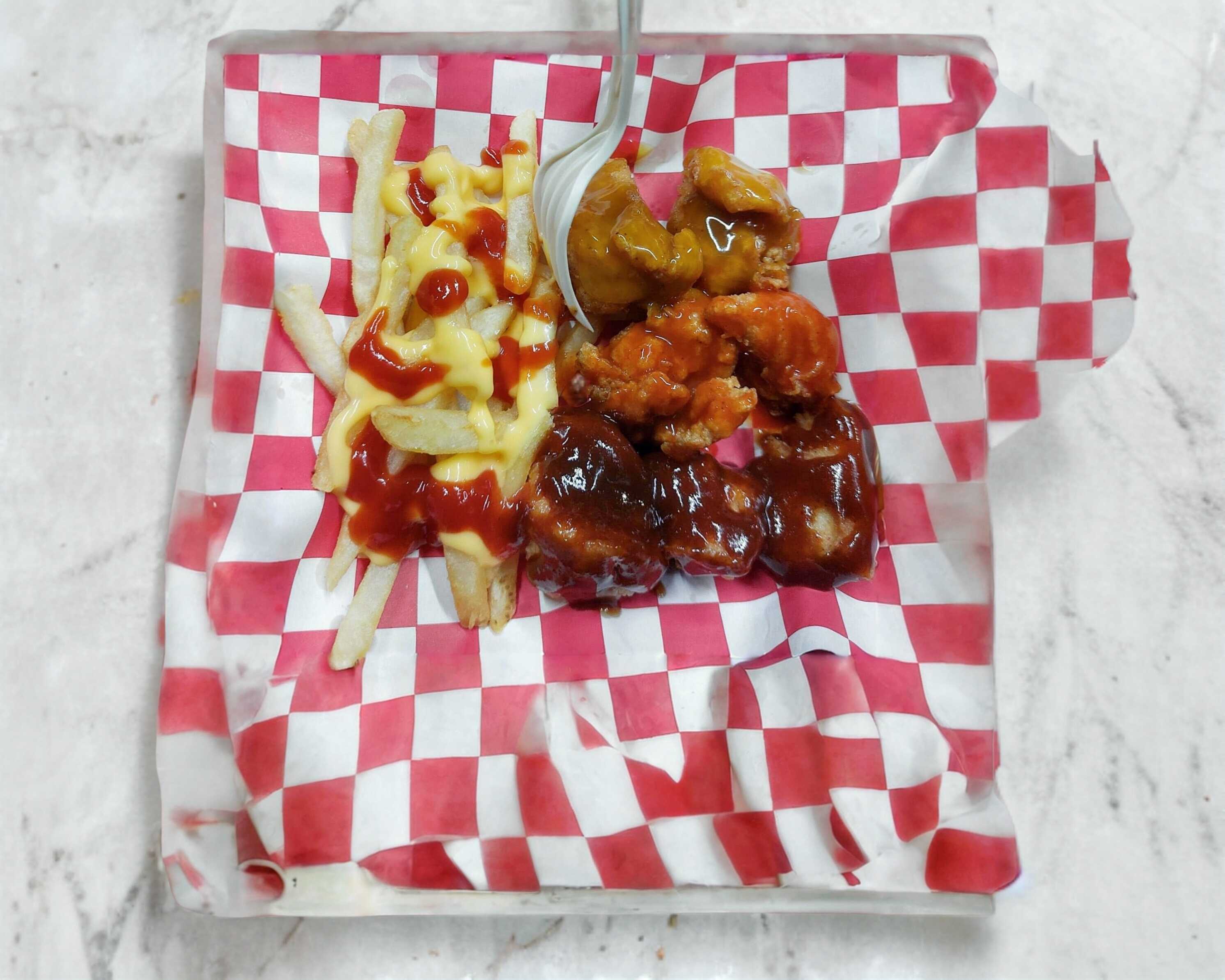 Orden de papas a la francesa con 5 nuggets, salsa valentina, catsup y queso para nachos 2 oz.