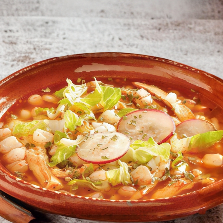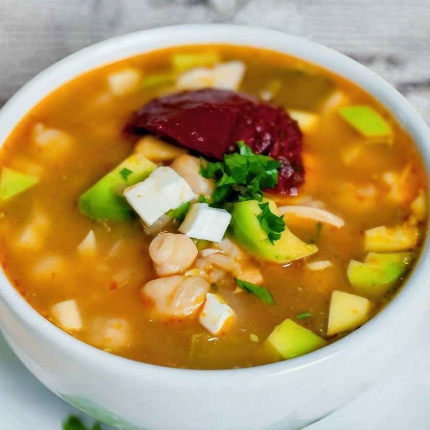 Consomé de pollo con verdura, pollo deshebrado, arroz, aguacate, queso, chipotle y el toque de nuestra casa.
