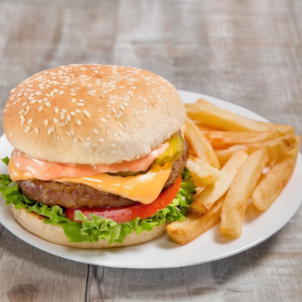 Pan tradicional de hamburguesa, deliciosa carne de res 120 g aproximadamente, queso amarillo, lechuga, jitomate y papas a la francesa.
