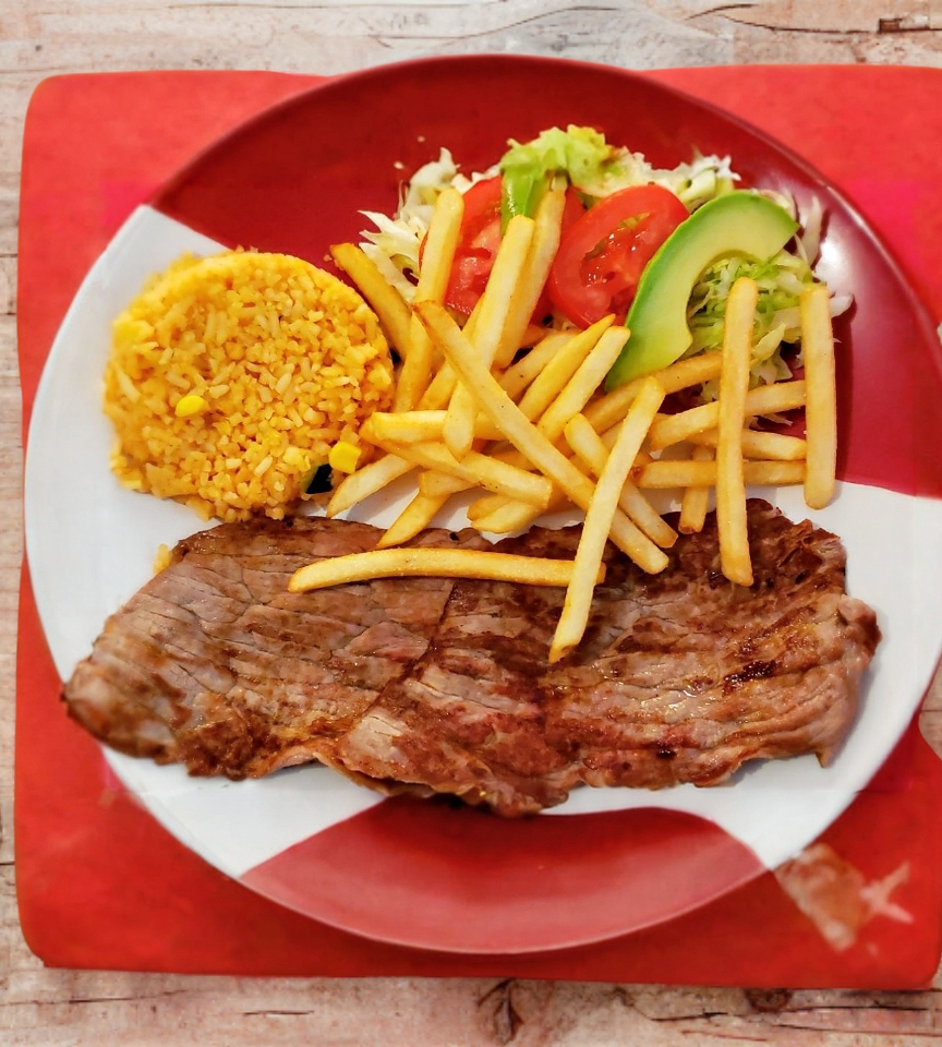 Deliciosa carne gratinada con queso manchego, lechuga, jitomate y papas a la francesa.