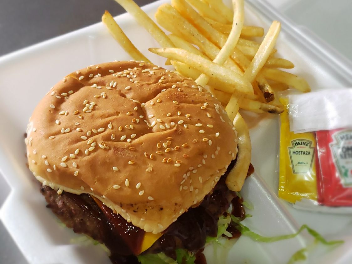 Rica carne de res bañada en salsa barbecue, acompañada de papas a la francesa.