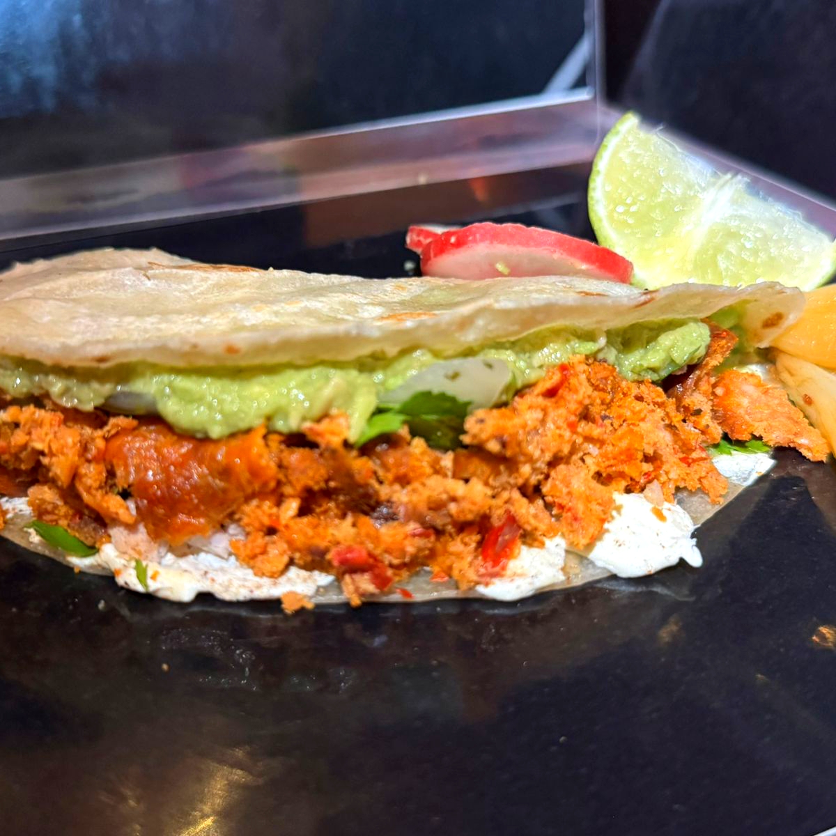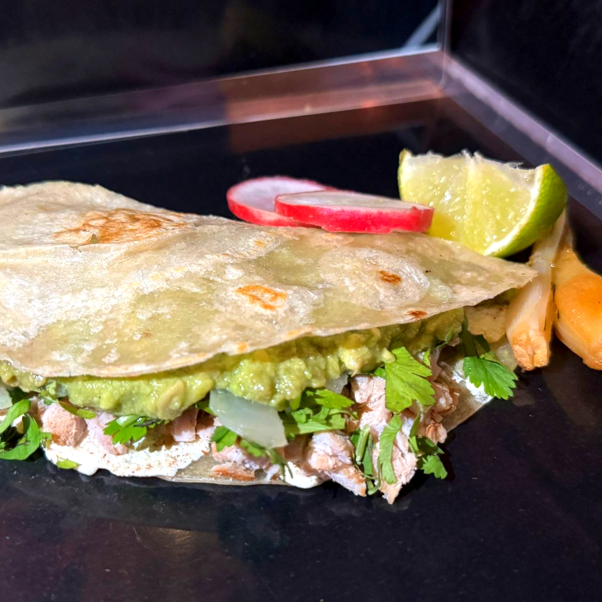 Quesadilla de tortilla de harina con guacamole, elige tu proteina + refresco + cebollita cambray