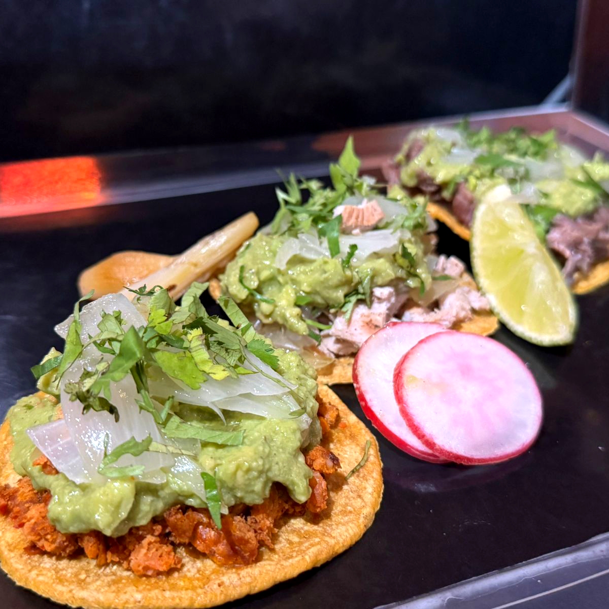 3 tostadas asada, cerdo y longaniza con guacamole cebollita asada picada + refresco + cebollita cambray