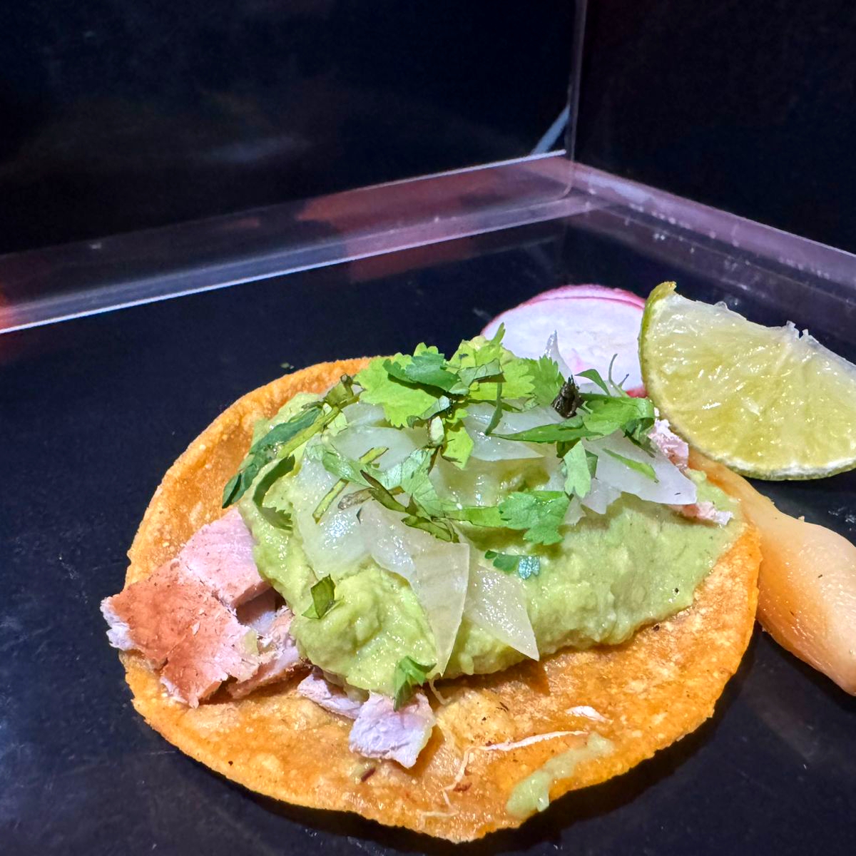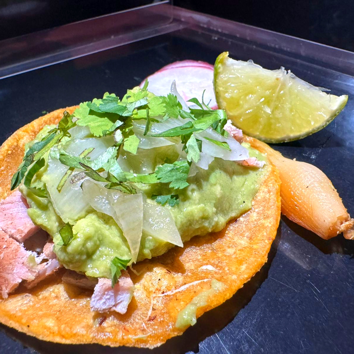 Tostada con 3 quesos derretidos, puerco, guacamole, cebolla asada y cilantro.