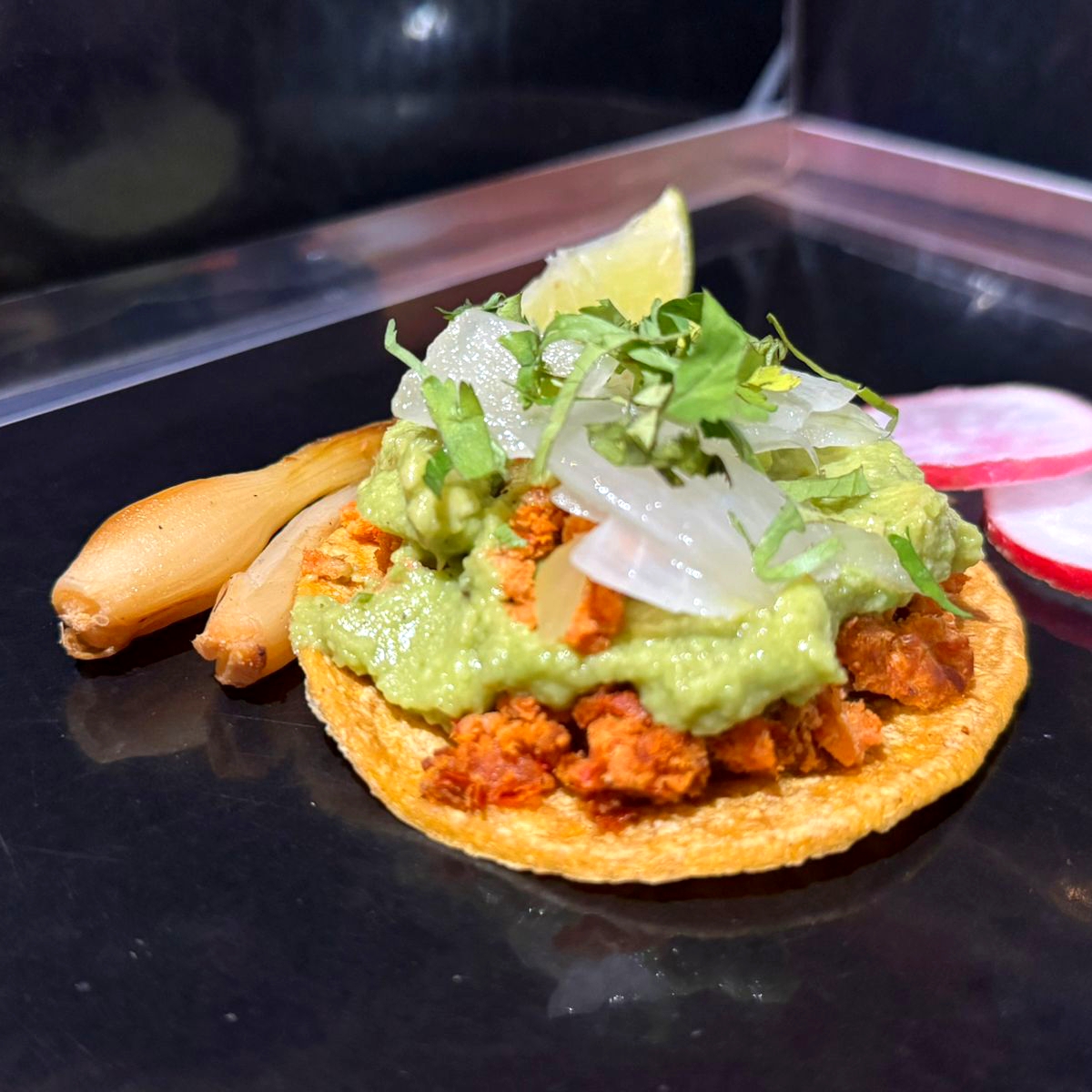 Tostada con 3 quesos derretidos, longaniza picante, guacamole, cebolla asada y cilantro.