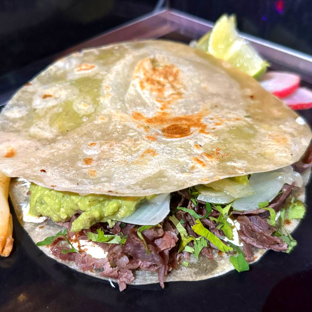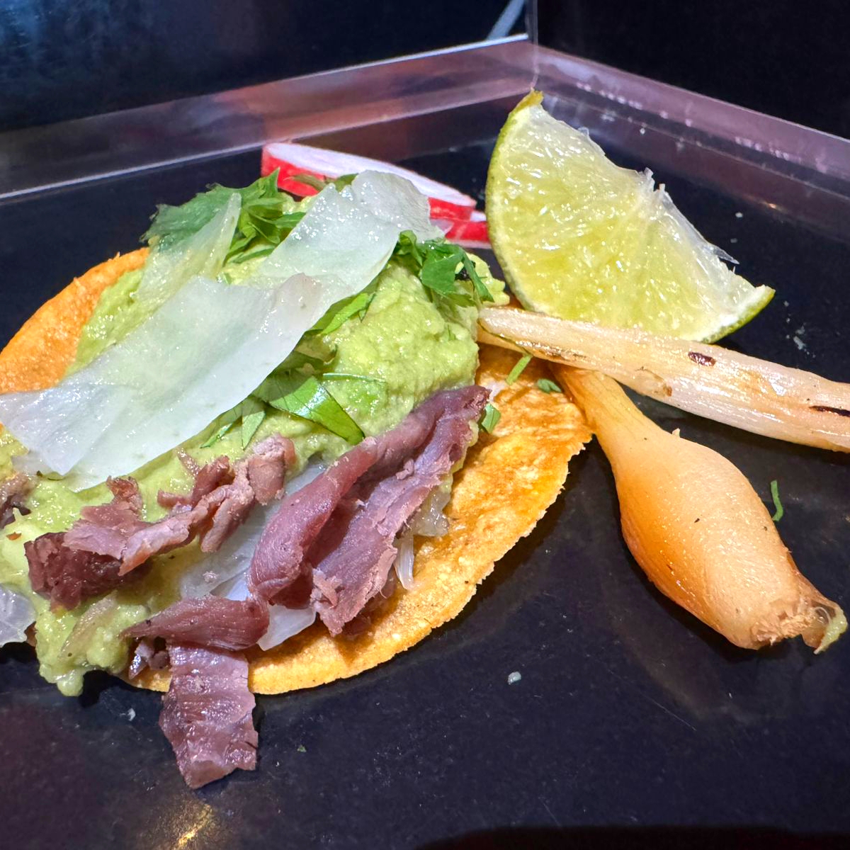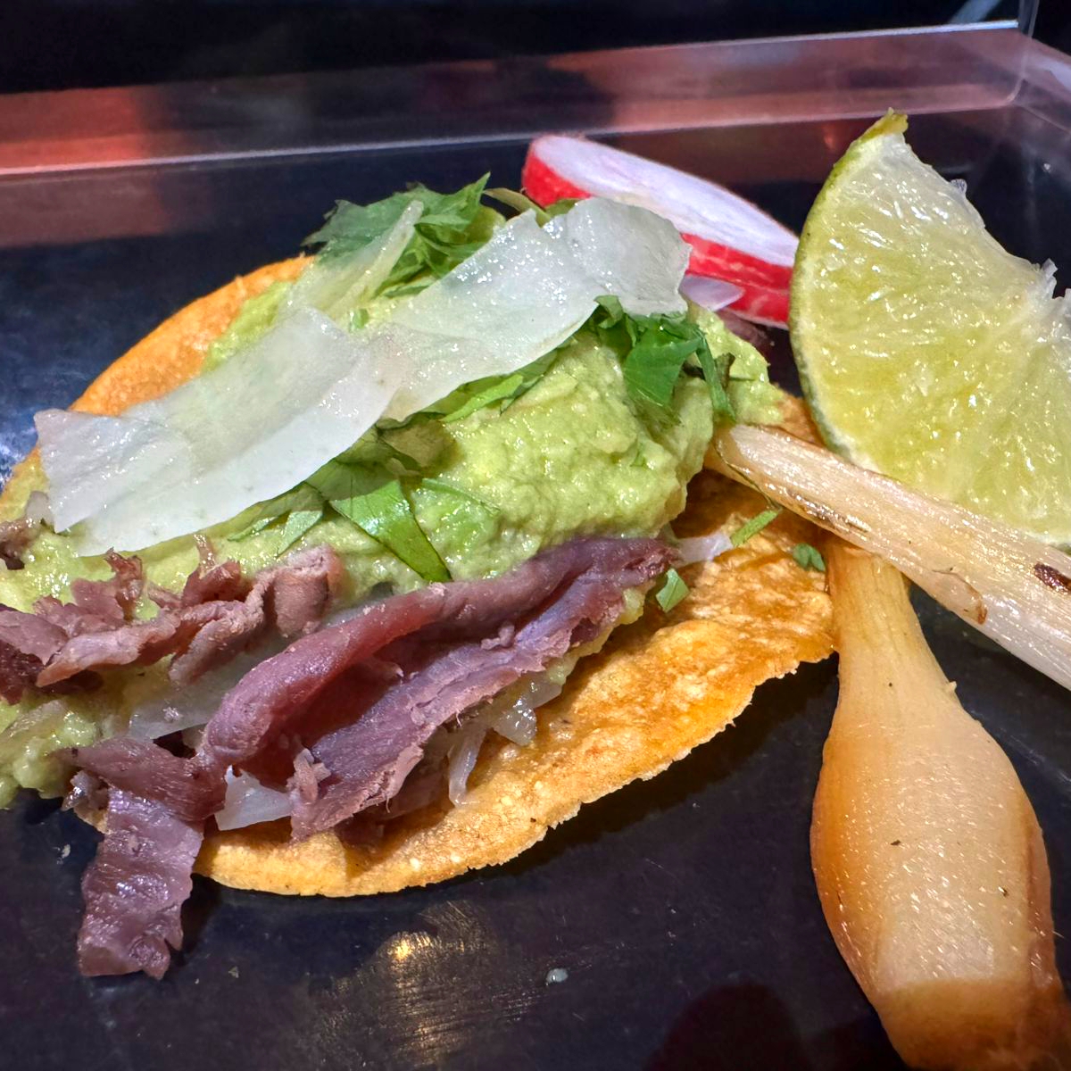 Tostada con 3 quesos derretidos, arrachera, guacamole, cebolla asada y cilantro.