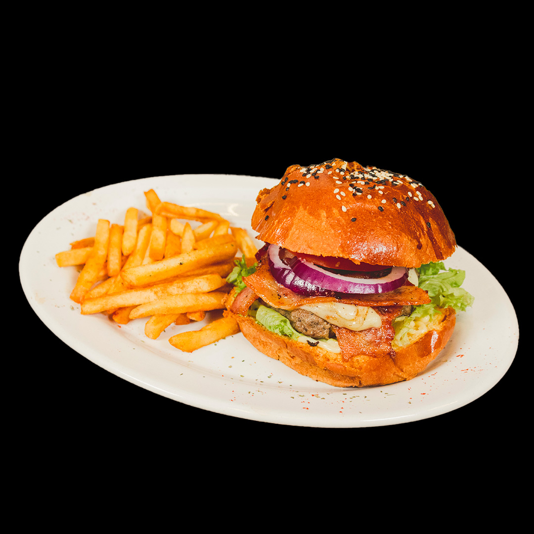 Hamburguesa de carne de res con BBQ, lechuga, tomate, cebolla.