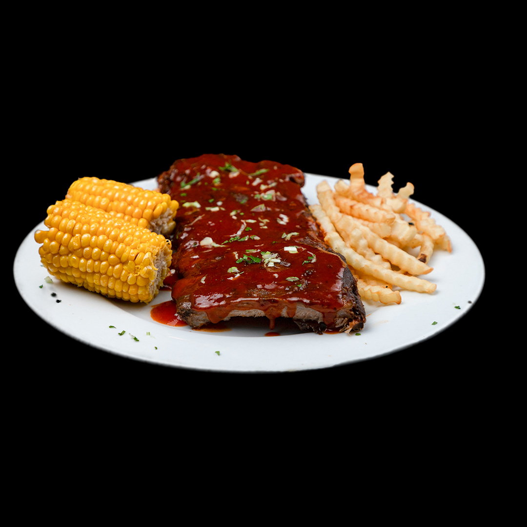 Costillas bañadas con salsa BBQ y verduras.