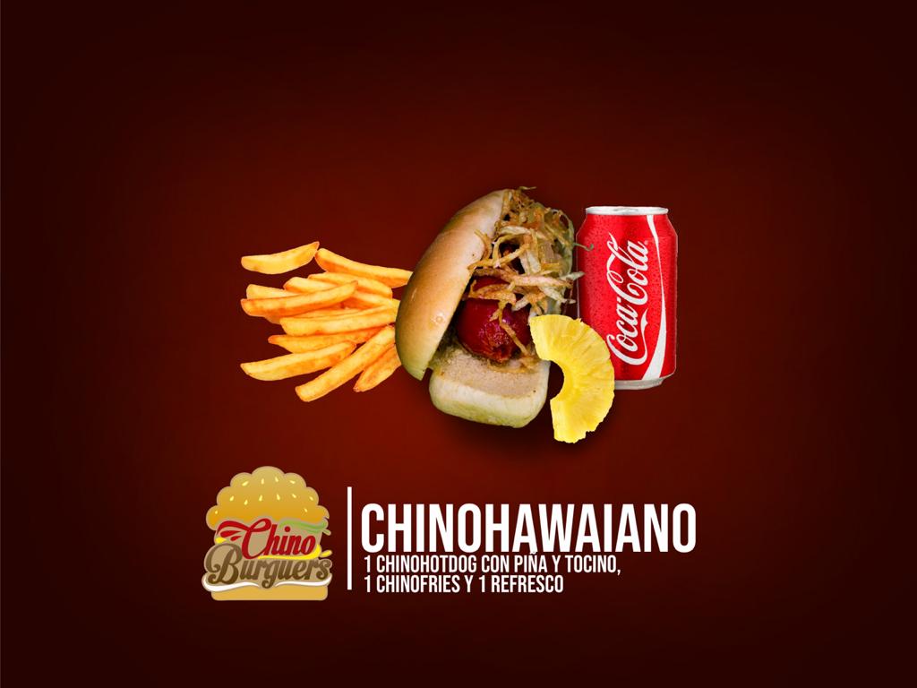 1 Chino hot dog con piña y tocino, 1 chinofries y 1 refresco 355 ml.