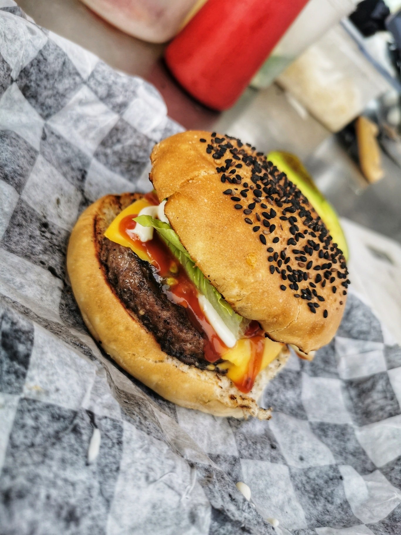 Hamburguesa sencilla 1 pza. Carne de res 113 g con queso amarillo, jitomate, lechuga, aguacate, jalapeño, cebolla, mayonesa, cátsup y aderezo de chipotle.