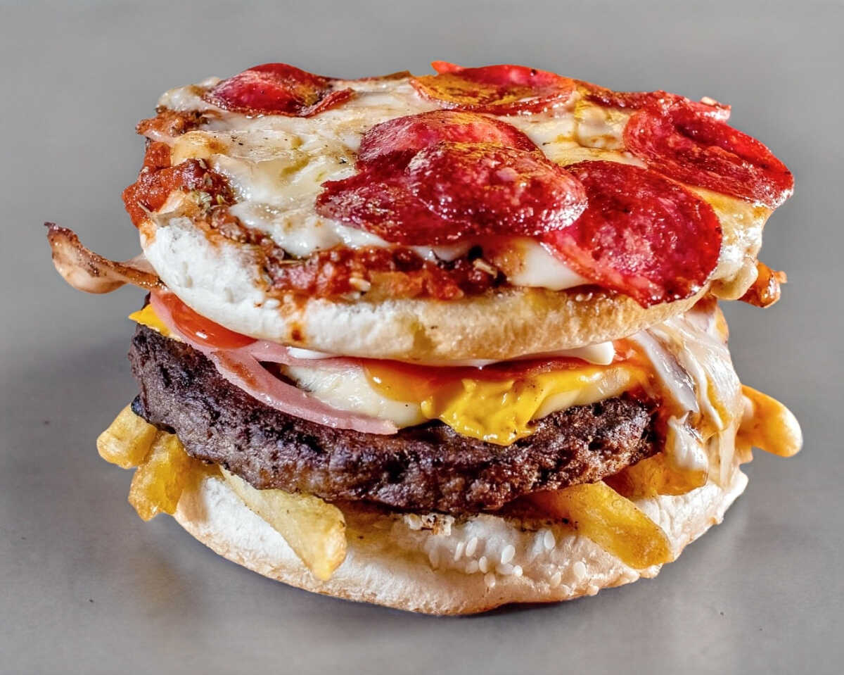 Hamburguesa carne arrachera o sirloin 150 g, queso amarillo, queso manchego, jitomate, lechuga, aguacate, jalapeño, cebolla, mayonesa, cátsup, aderezo de chipotle. En la parte superior (la tapa de la hamburguesa), lleva 1 mini pizza.