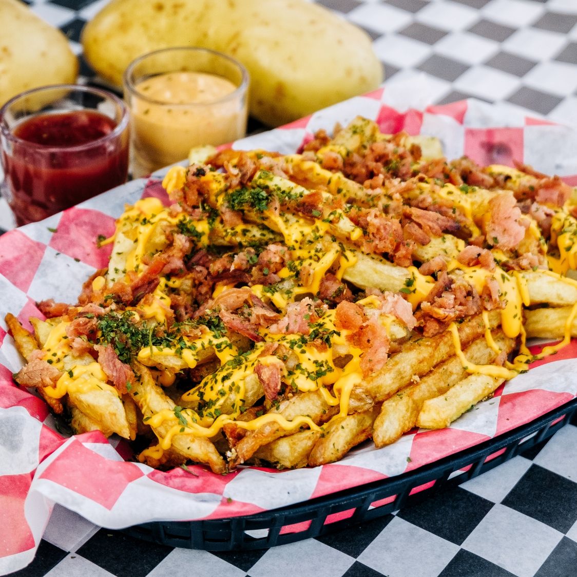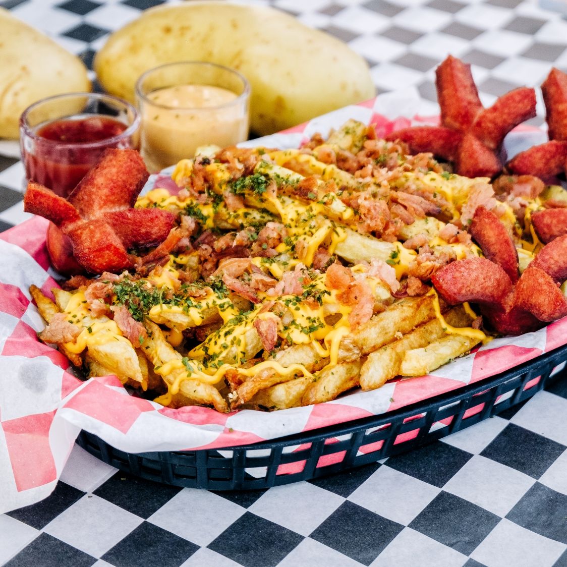 1 kg Pesado en crudo de papas fritas naturales con queso, tocino y salchipulpos, condimentadas.