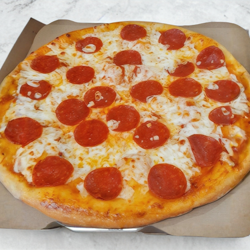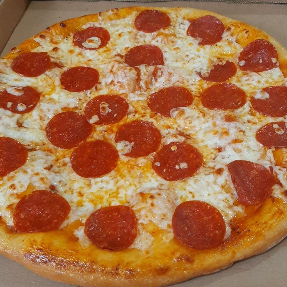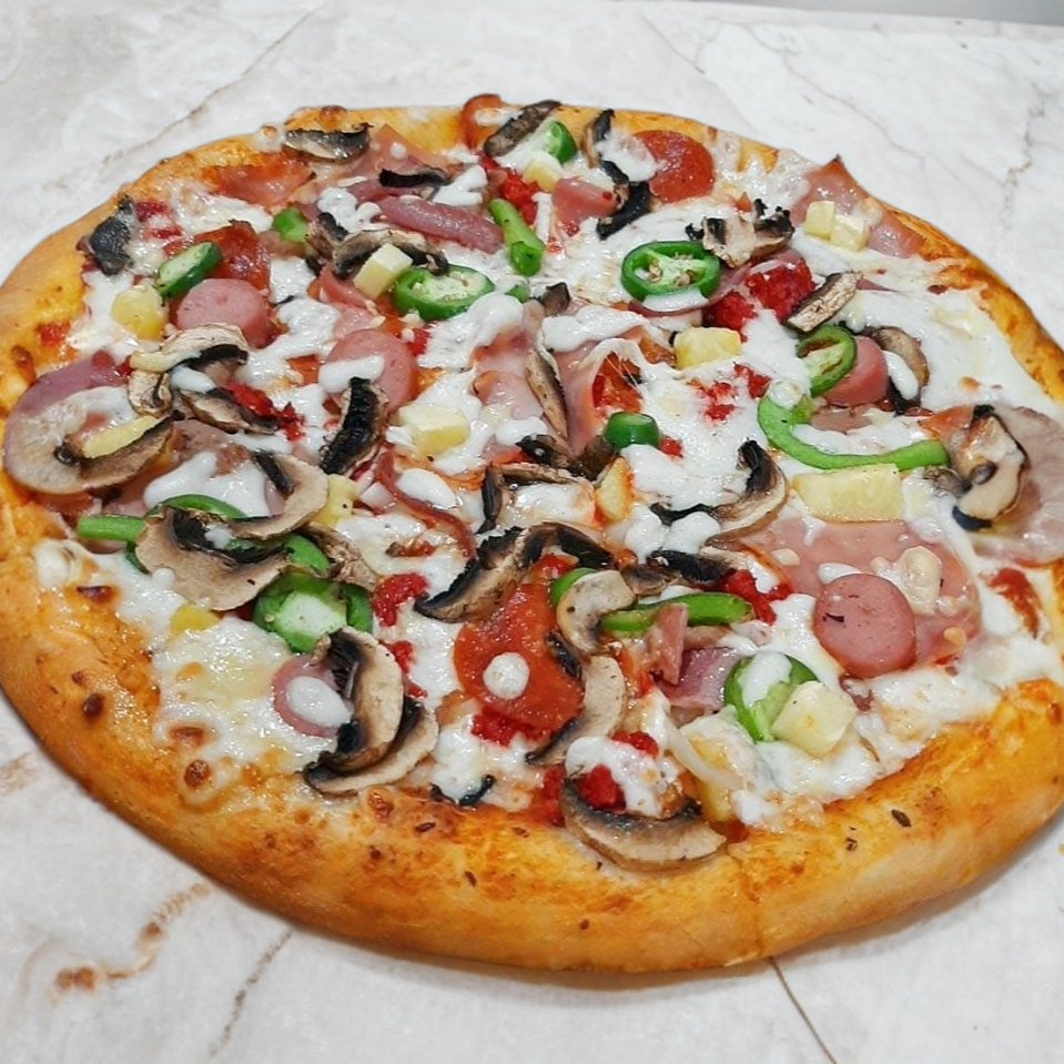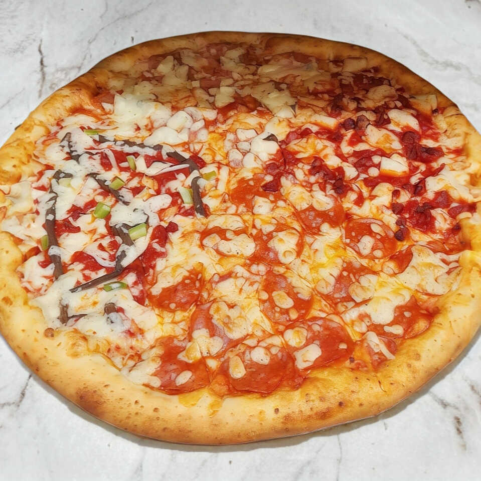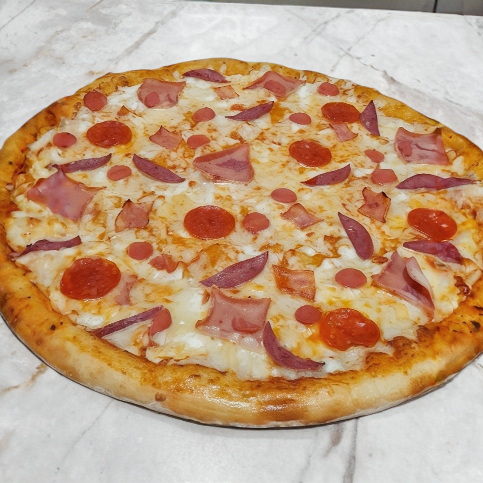 Salami, Queso mozzarella salchicha, tocino, jamón y Pepperoni, orilla bañada con mantequilla y ajo