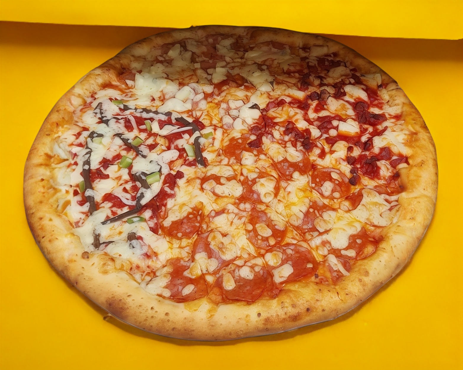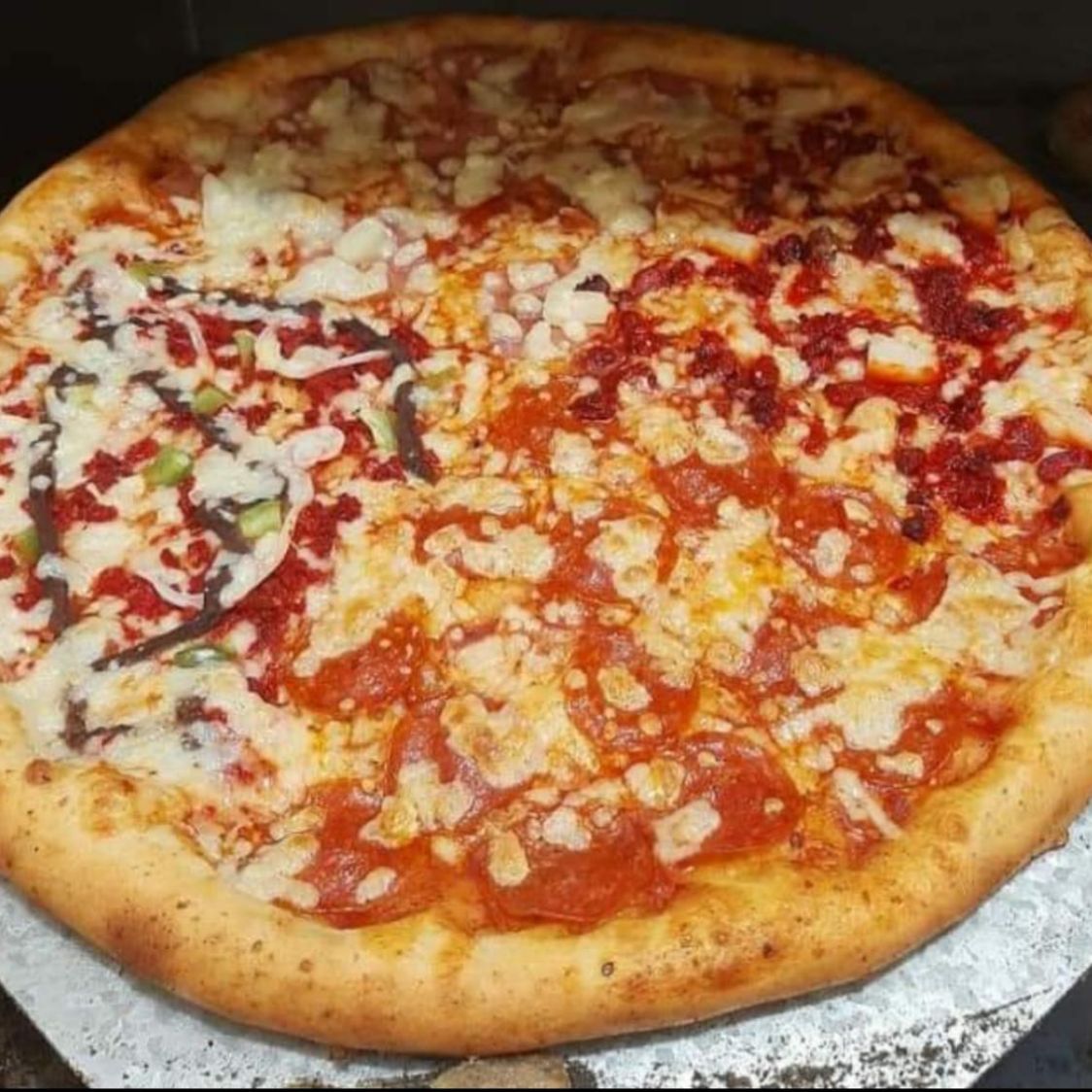 Mitad carne de pastor y piña / Mitad champiñones, cebolla, piña y pimiento (orilla bañada con mantequilla y ajo)