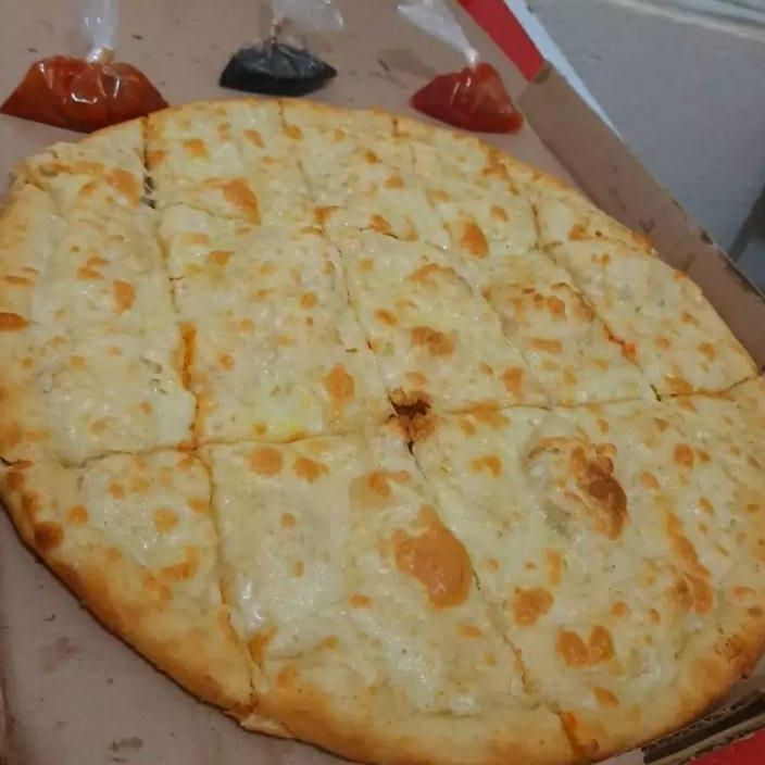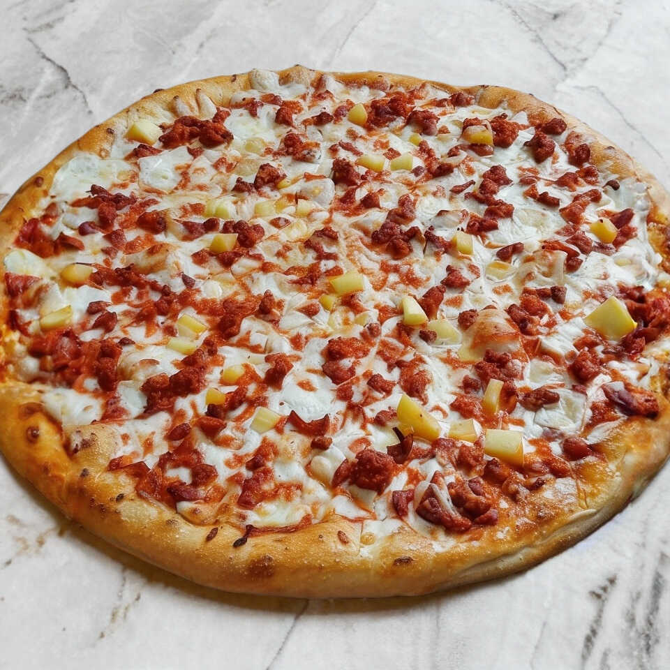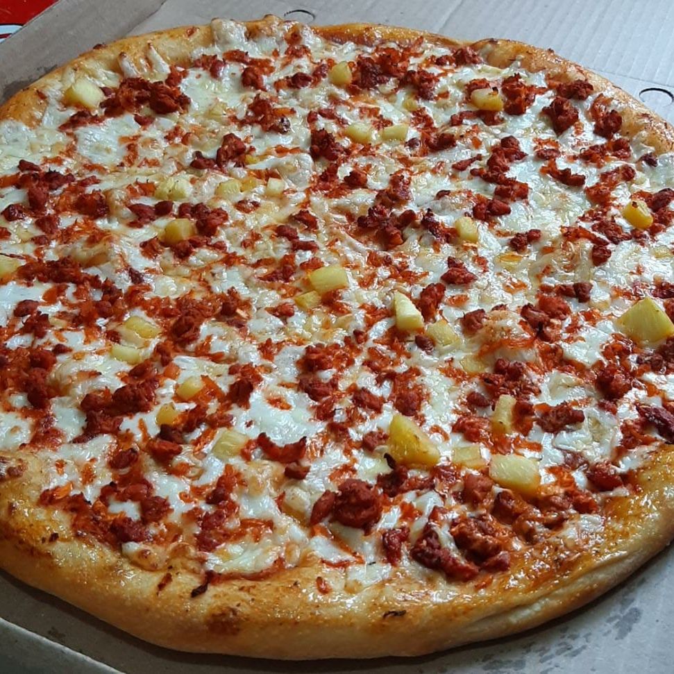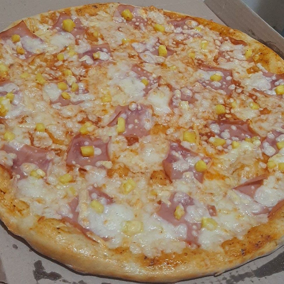 Queso mozzarella, piña, cebolla, champiñón y Pimiento. Orilla bañada con mantequilla y ajo