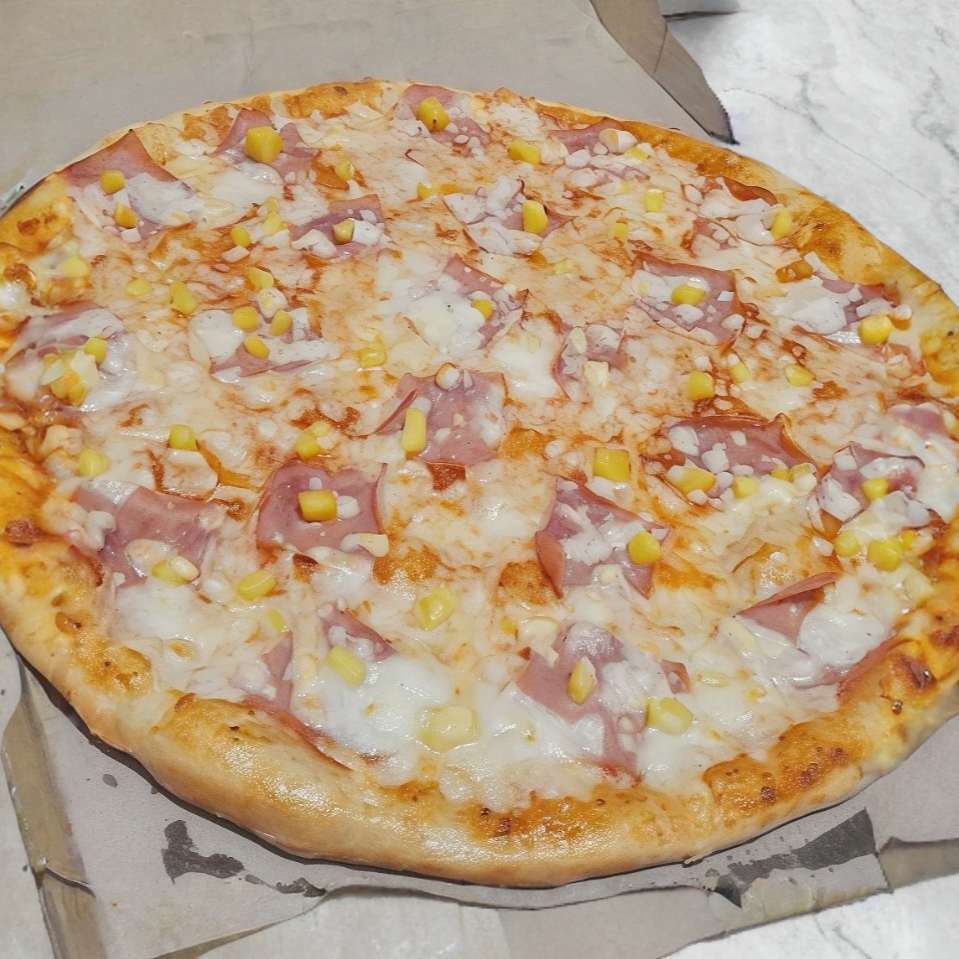 Queso mozzarella, salami Salchicha, tocino, jamón, pepperoni, Cebolla, jalapeño, Pimiento, chorizo, champiñones, frijol y Piña, Orilla bañada con mantequilla y ajo