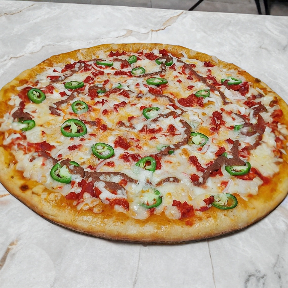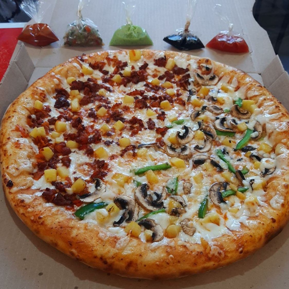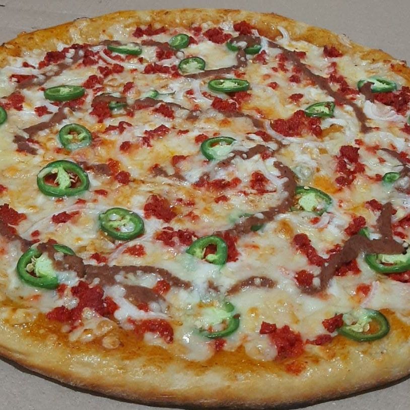 Salami Salchicha, tocino, jamon, pepperoni, Cebolla, jalapeño, Pimiento, chorizo, champiñones, frijol y Piña Orilla bañada con mantequilla y ajo