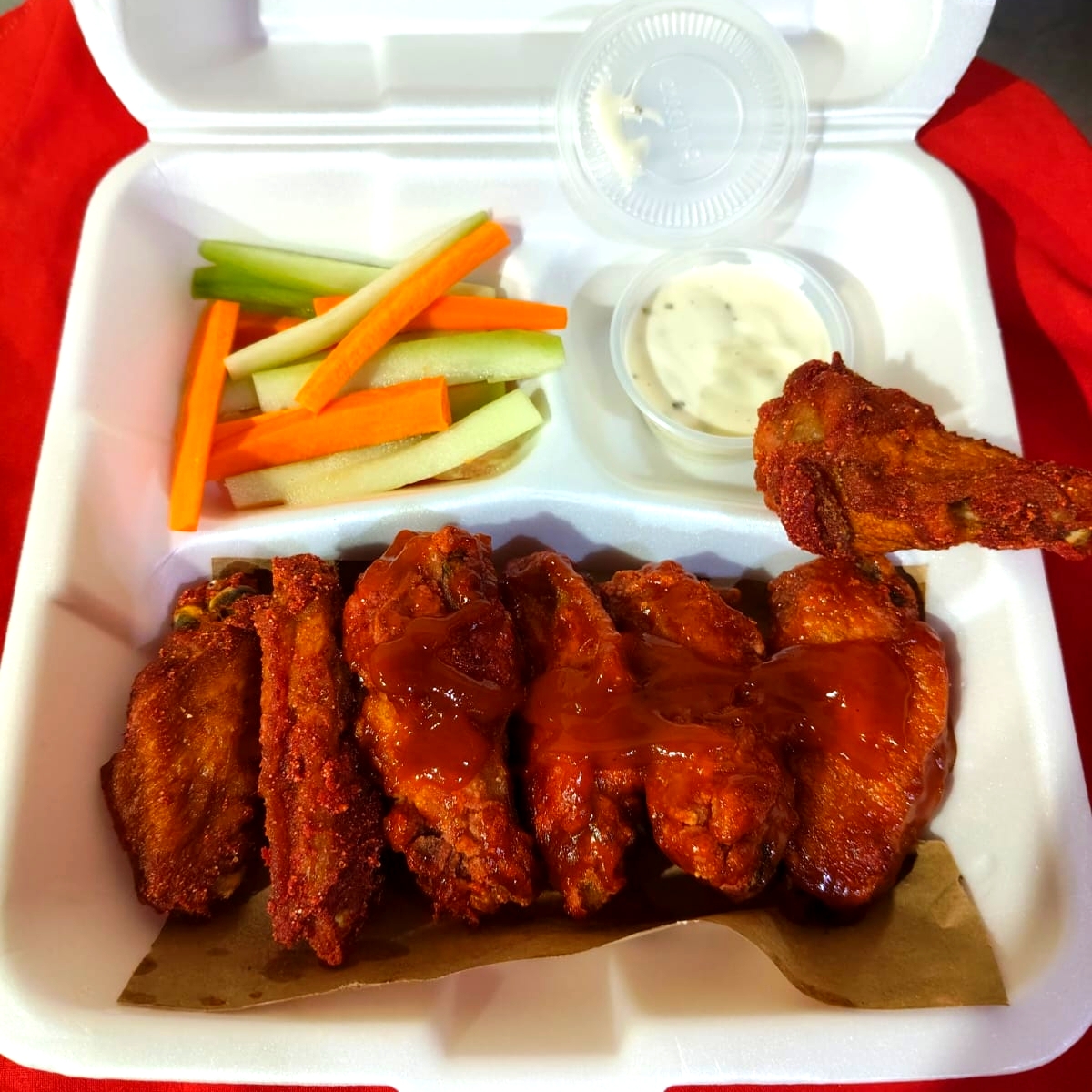 7 alitas grandes sabor barbiquiu con chile habanero acompañado de zanahoria, pepino y aderezo