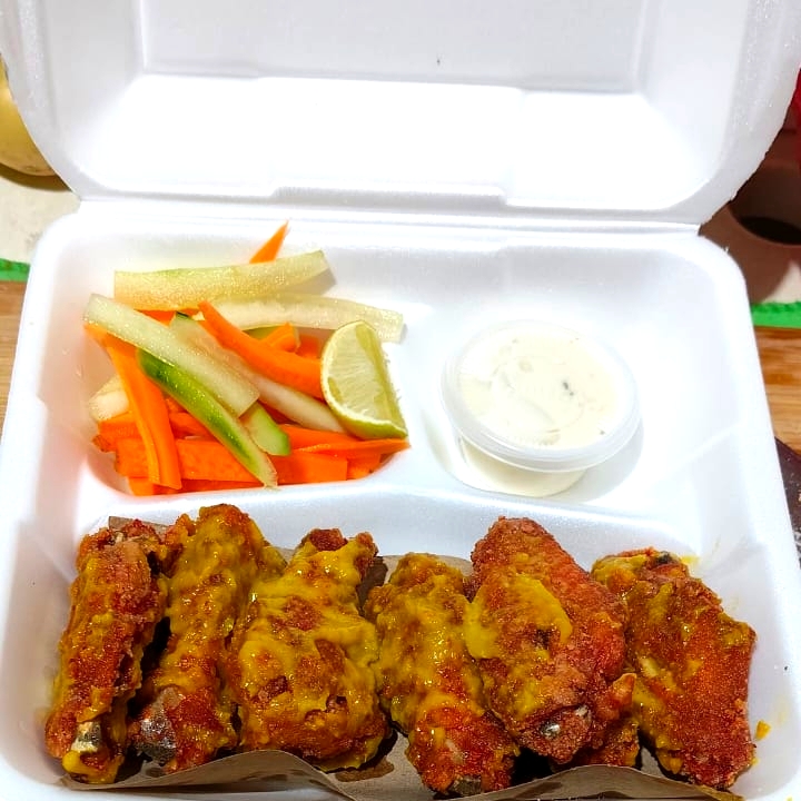 7 alitas grandes sabor mango con habanero acompañado de zanahoria, pepino y aderezo