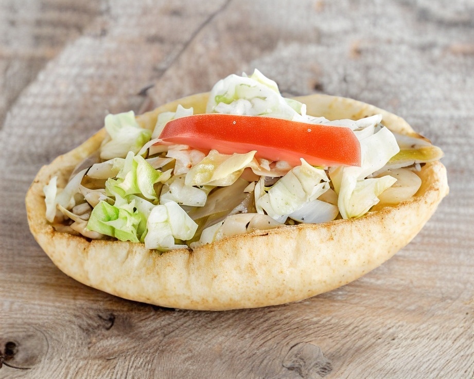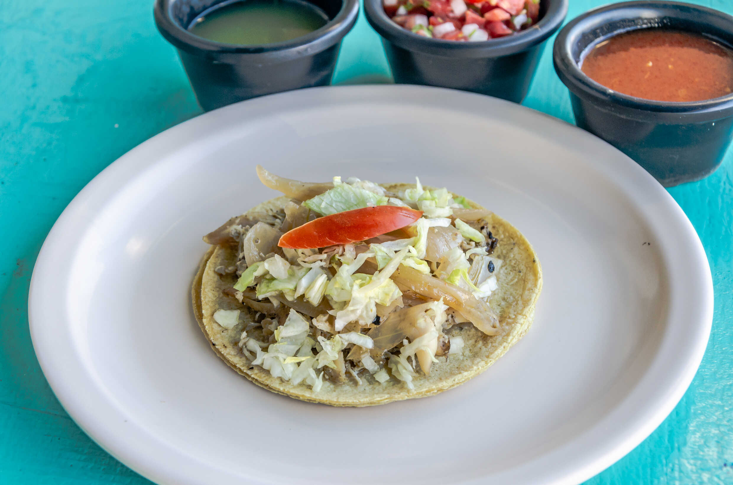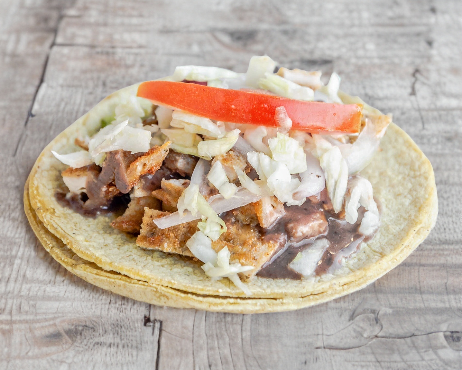 pollo empanizado, cebolla curtida, frijol, romanita y tomate.