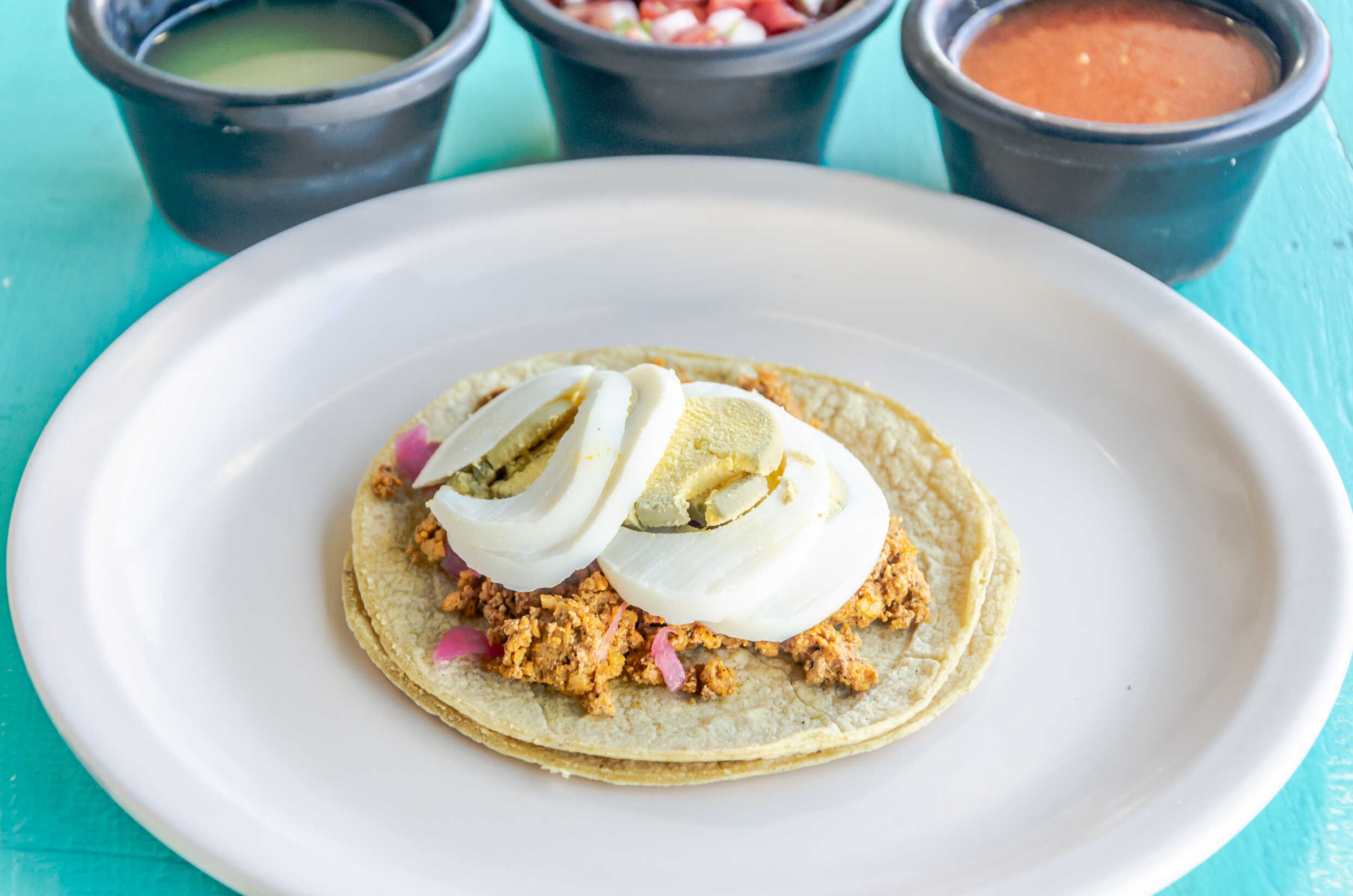 Carne de puerco en lomitos, con cebolla curtida y huevo cocido