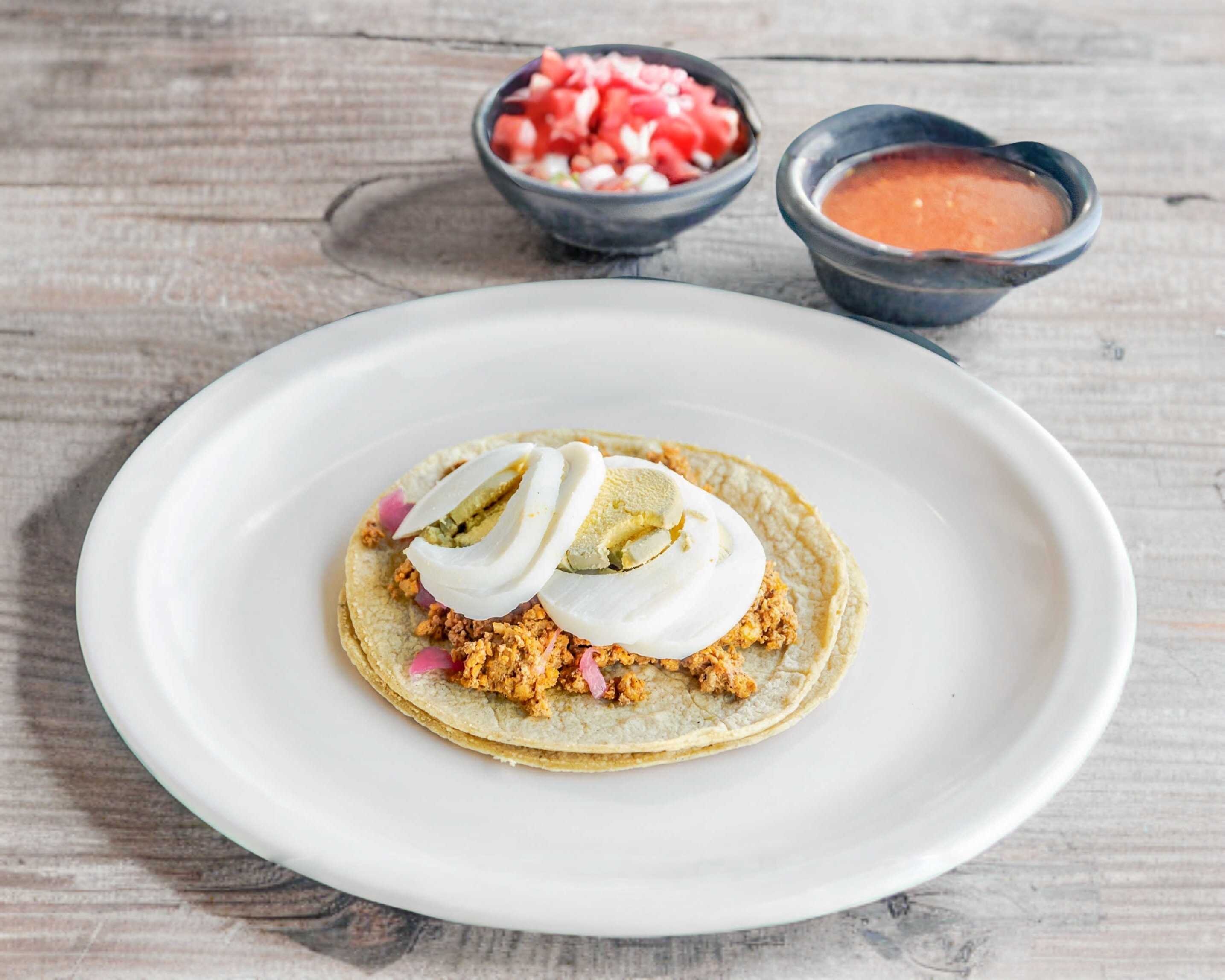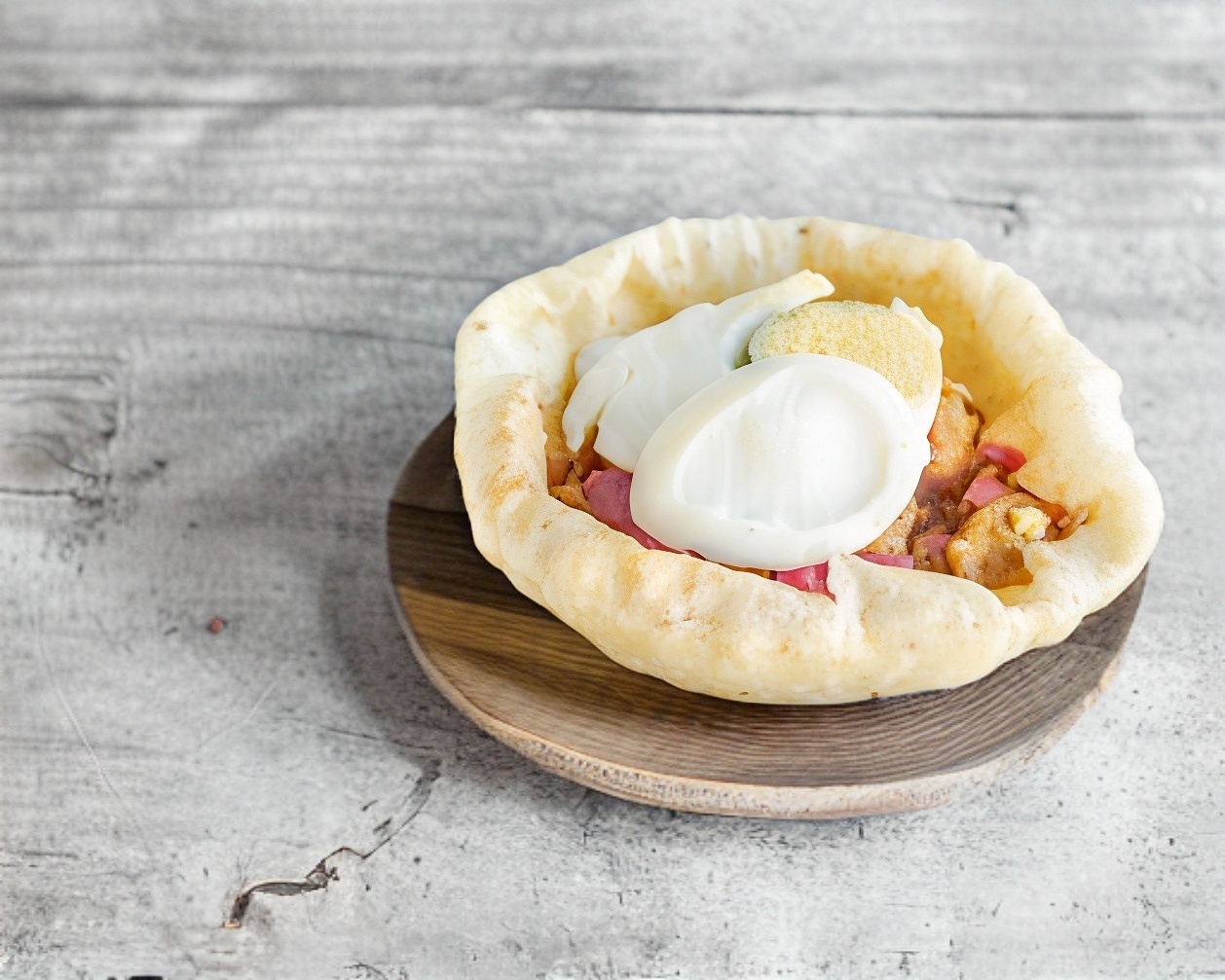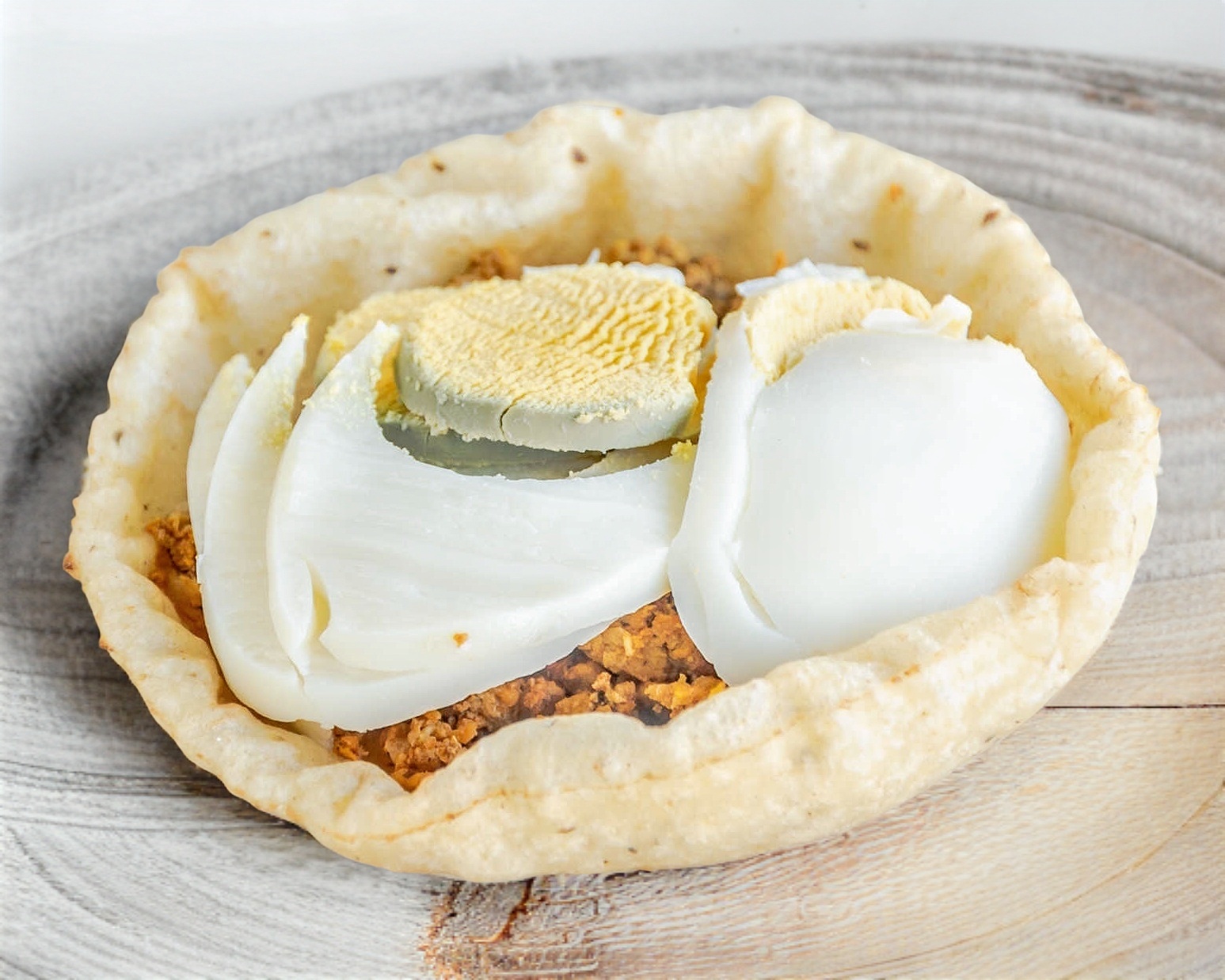 Pan de bollillo, Carne molida, cebolla curtida y huevo cocido.