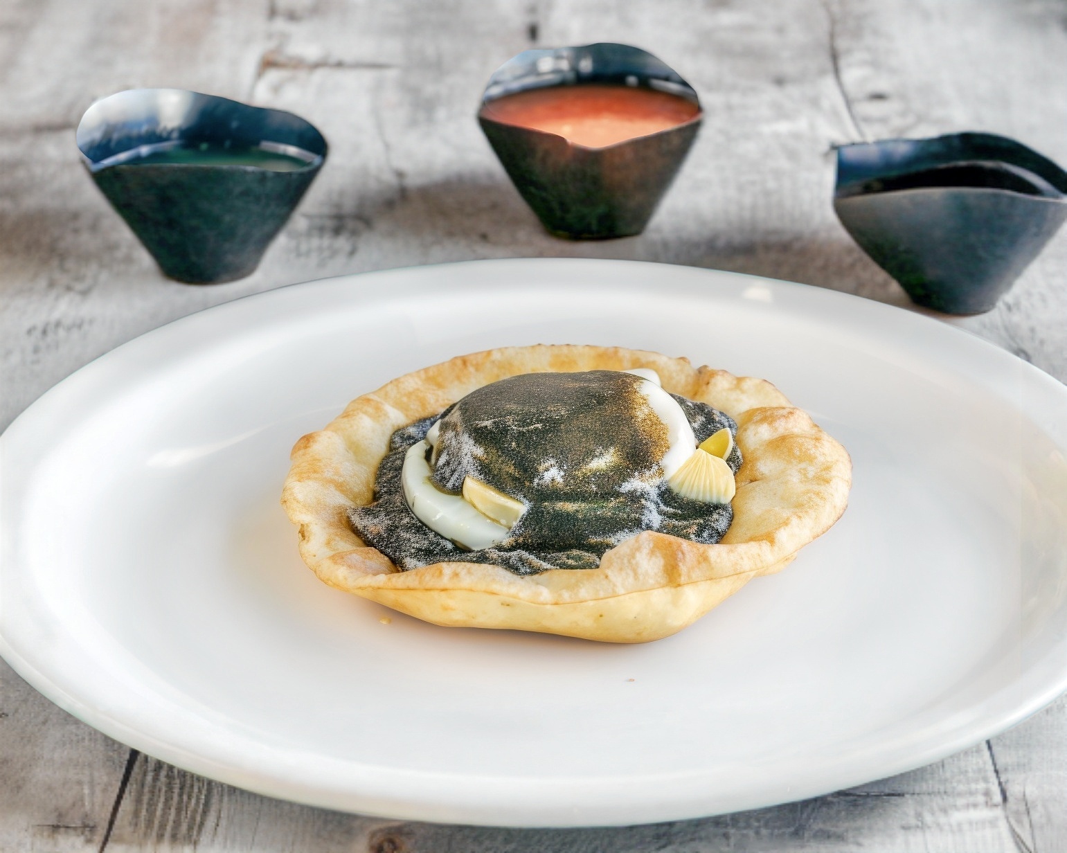 Patita de cerdo capeada sin hueso, cebolla curtida y tomate.