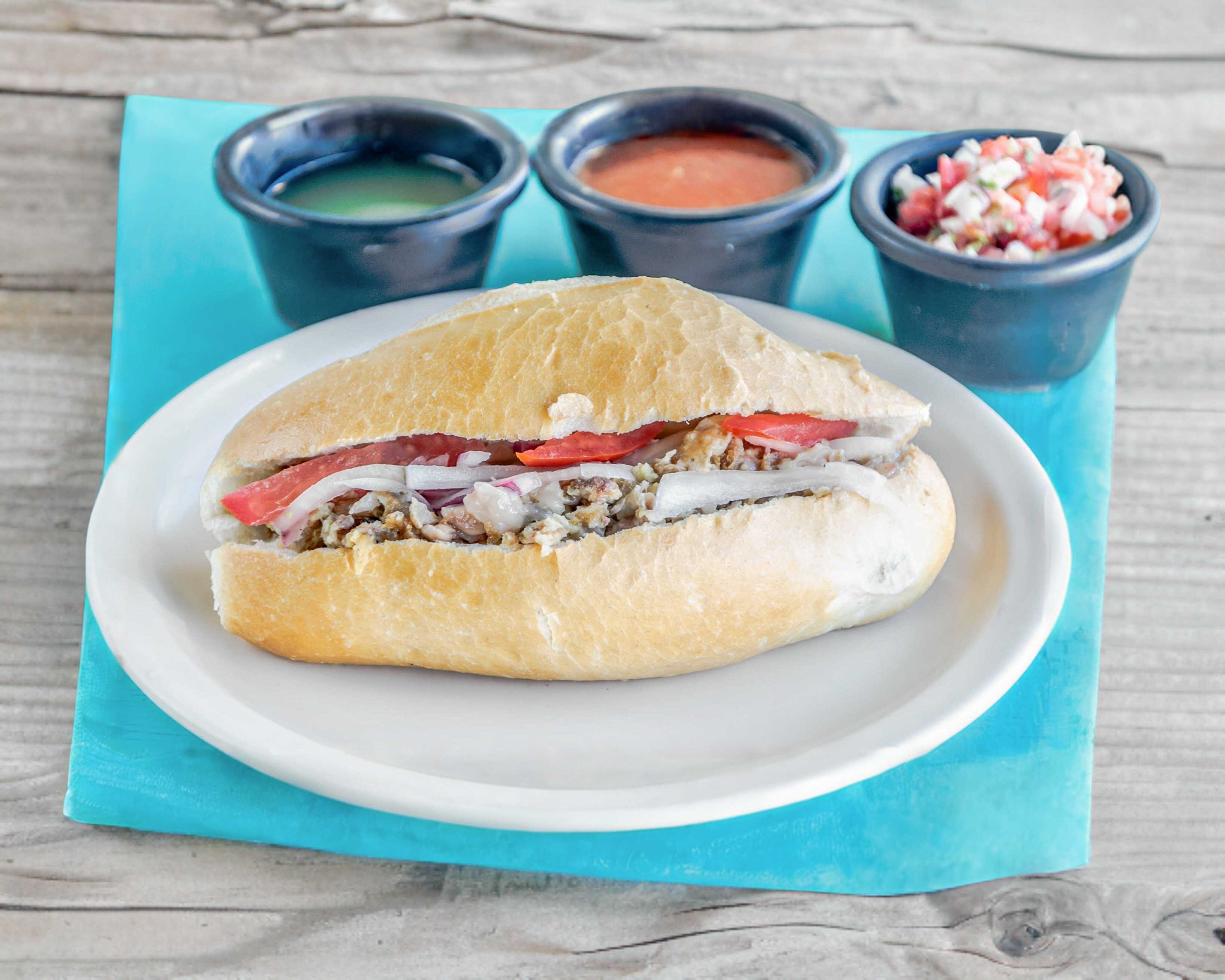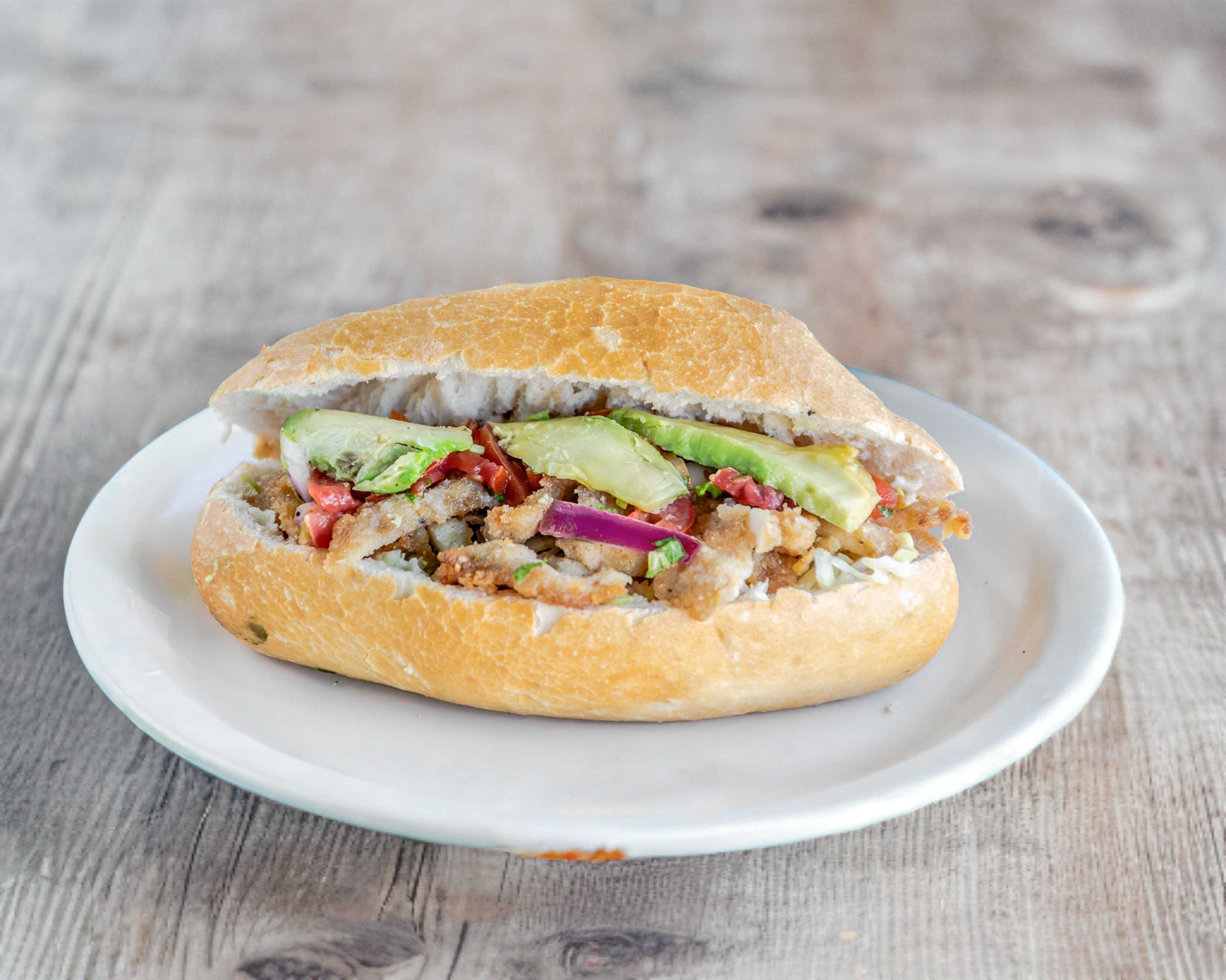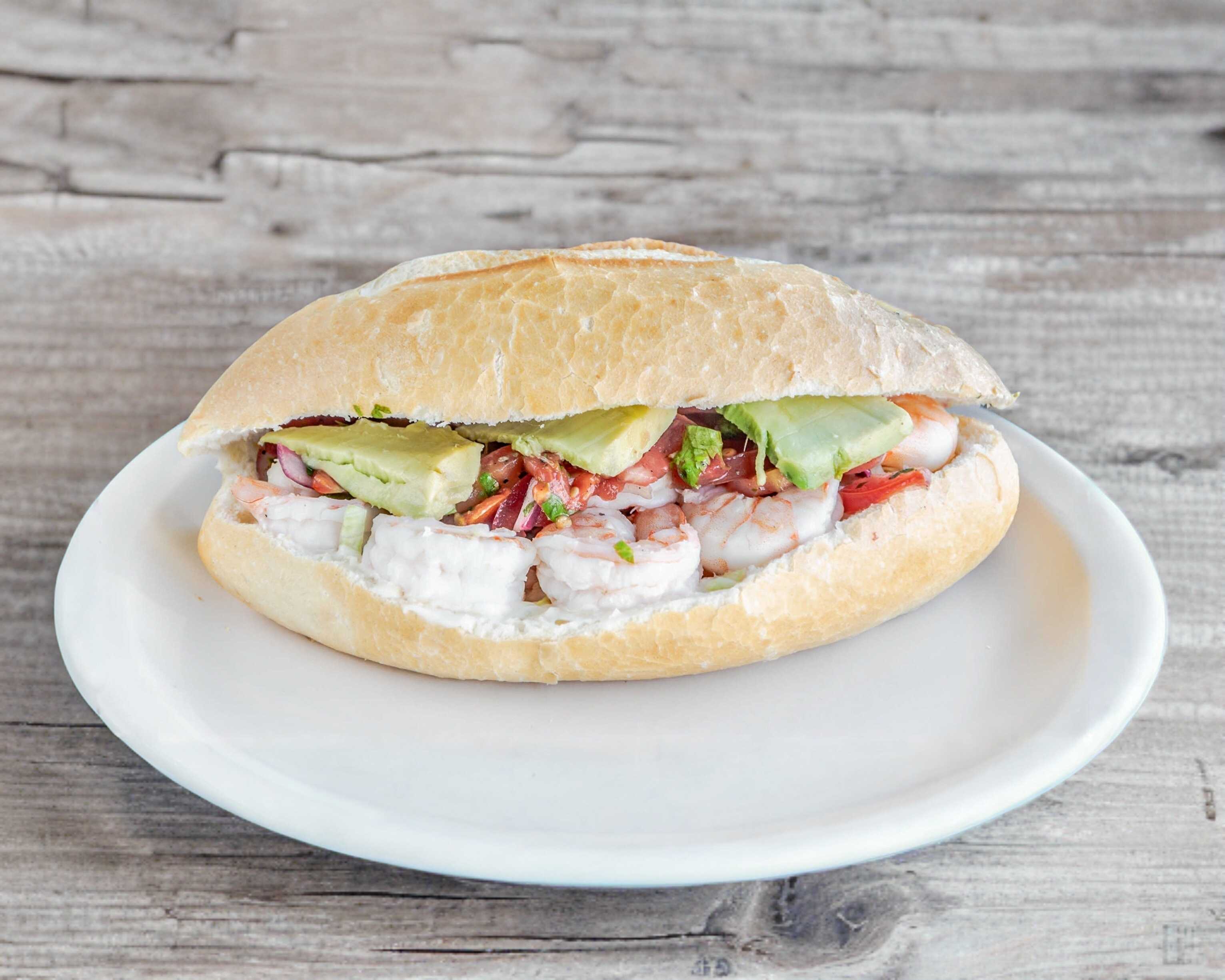 Pan de bolillo, Camarones empanizados con salsa (tomate, cebolla, pimienta, cilantro y aceite verde), aguacate y mayonesa.