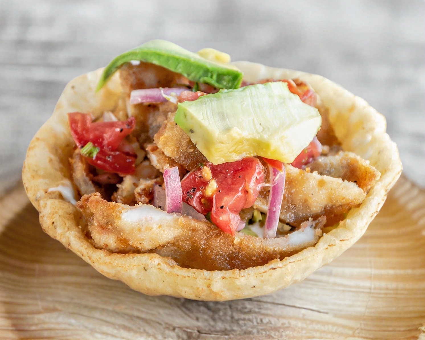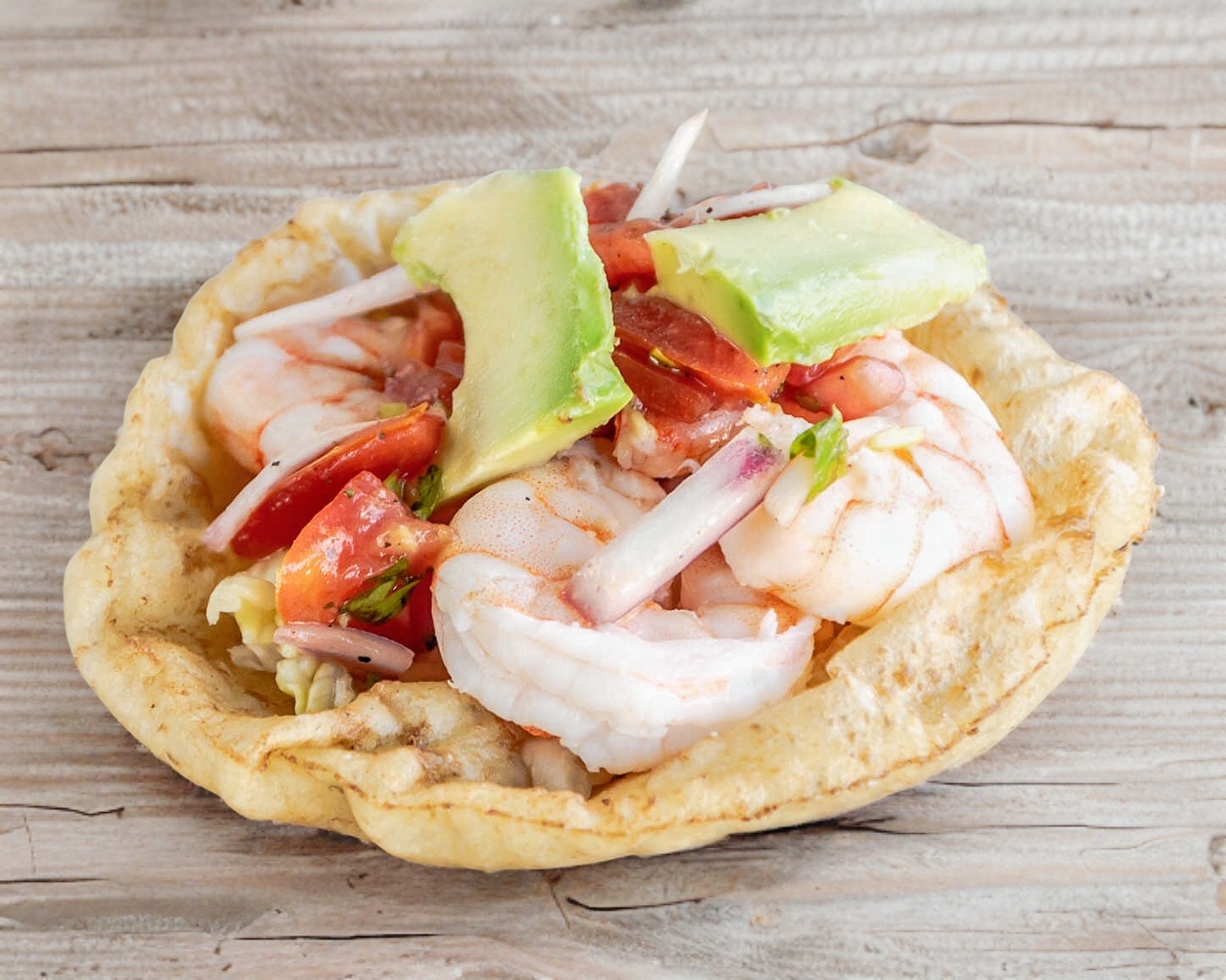 Camarones empanizados con salsa (tomate, cebolla, pimienta, cilantro y aceite verde), aguacate y mayonesa.